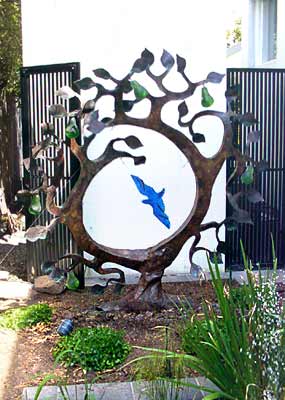 This work was made to give different views from the various rooms that look onto the courtyard. Looking in the front door you can see through to the courtyard. Coming down the stairs from the bedrooms they see the single bird flying over the pond. In the dining room there is a single glass pear - "picked" from the tree. The combination of copper and glass gives a different effect at each time of day and mood of weather. This sculpture was designed to give a lifetime of joy.