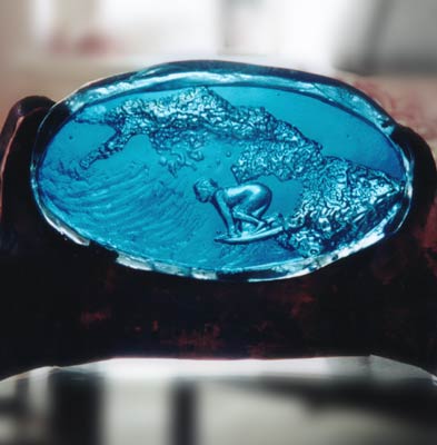 A negative casting in blue crystal, 15cm high in a copper frame. Made as a 21st birthday present for a surfing fanatic.