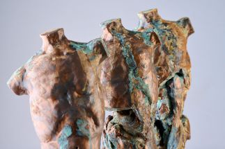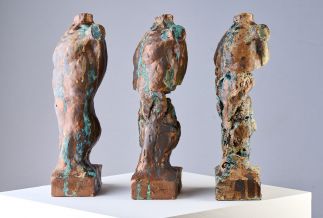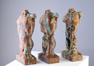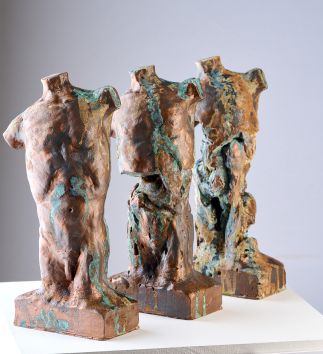 This three-part sculpture represents the process of disintegration. Things that we once regarded as permanent change over time as they decay and degrade. What once was whole is hollowed out and takes on new shapes as it ages. Nature at work. The three parts can be arranged in many ways to be viewed from multiple viewpoints. The work was created from an original clay sculpture of a male torso, from which a mould was made so that the three stages of disintegration of the body could be formed using hydrocal, a strong gypsum-based plaster. Then the pieces were painted with iron and bronze paints and patina was applied to create the rusting and patination.