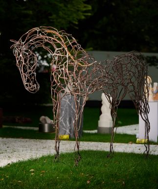 This mild steel sculpture showcases an exceptional level of craftsmanship, capturing the poised and regal nature of a royal horse with both boldness and tenderness. The artist’s sophisticated manipulation of the material allows for a nuanced representation of strength, grace, and power, conveying a dynamic form that feels simultaneously fierce and delicate. The exceptional attention to detail in both gesture and structure elevates the piece, making it a compelling and emotionally charged work of art.