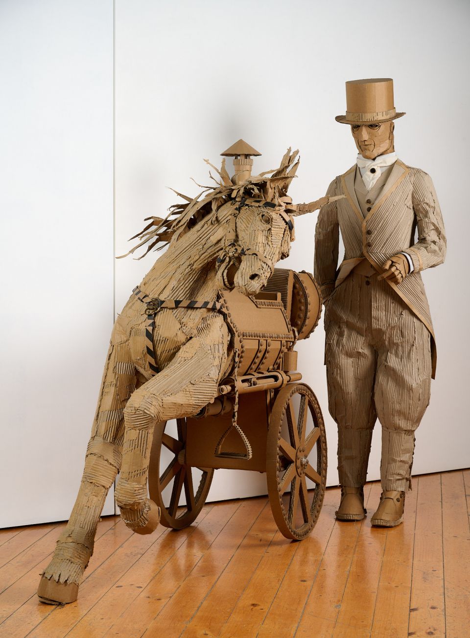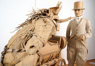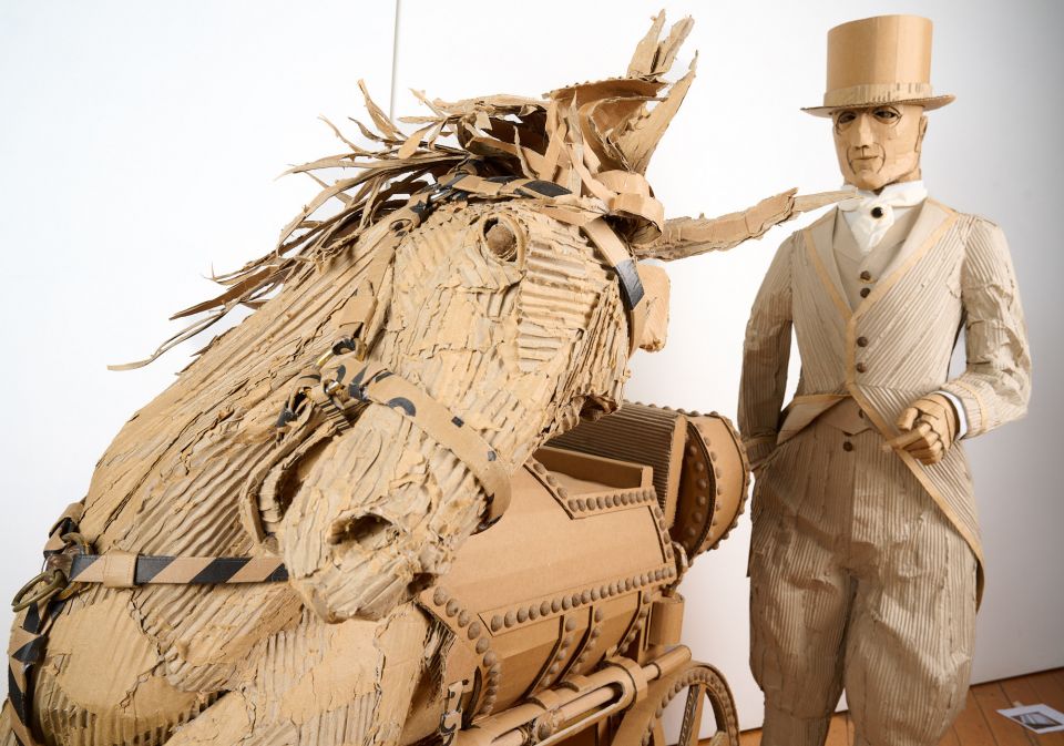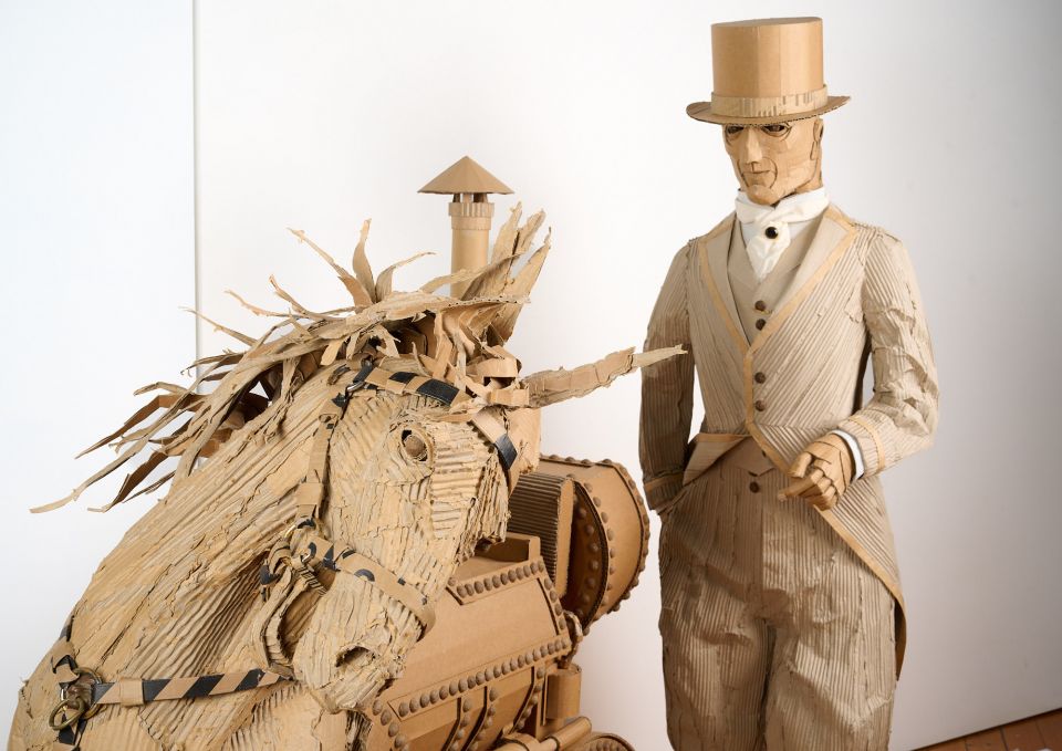 EQUUS MACHINA Horsepower reclaimed This hybrid form, half Horse, half steam engine, reimagines the industrial age through the fragile skin of recycled cardboard. Once a symbol of freedom and raw strength, the horse displaced by the iron machine that reshaped landscapes and fuelled industry. Here the two are fused together, both rival and reflection. I use recycled cardboard, what was once packaging becomes sculpture, a sustainable practice that critiques the cycle of consumption driving environmental decline. Both horse and steam engines are ghosts of progress, yet in cardboard form they remind us that all engines run down, and all strength eventually returns to the earth.