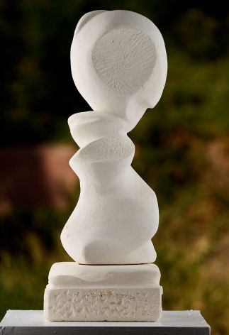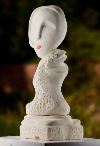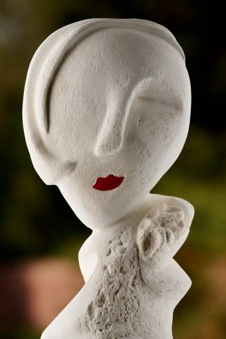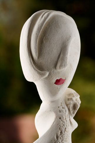 This lady, carved from limestone with shells and quartz exposed, has a calm but confident expression. The reverse has an abstract design reflecting this strength of the lady with the red lips.
