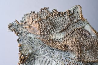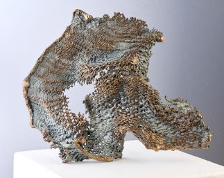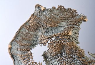 This work uses a piece of knitted textile that I cast in bronze using the traditional lost wax casting method . i wanted to explore the capabilities of my insubstantial diaphanous textile objects resilence when cast in bronze. It's replication I further e