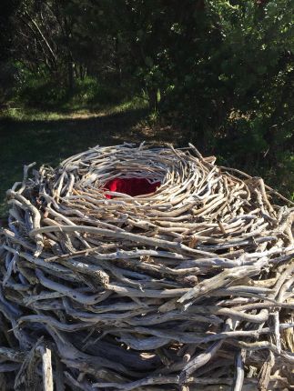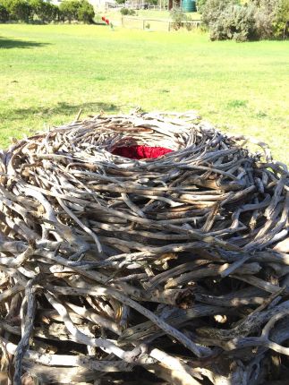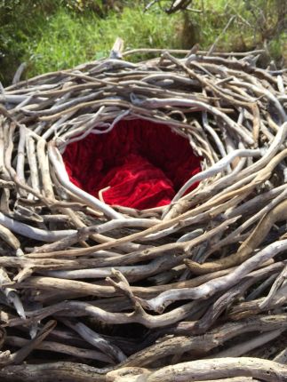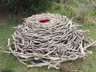 The sticks form a shape of a nest. The rough arrangement creates a home. This home is a safe haven for nurturing and observing. The sticks represent building blocks of an environment we use to shelter in. I find the act of collecting meditative and the construction of a nest shape brings a holistic sense of wellbeing. Branches, sticks and twigs are sourced from my immediate surroundings, from deserted beaches or my back paddock. Firstly, sticks, branches and twigs are sorted into groups from biggest to smallest. The assembling of the sizes is a critical part of the construction. This process is particularly precarious as the shape takes form, it might collapse or I don’t like the way it is forming, I start again, to make sure the foundation branches are placed correctly and strong enough to withhold the weight and often predetermines the overall profile. (Some nest shapes have a broad wide opening, funnel, long pipe shapes, tall and eagle-shape nest, untidy and spontaneous). I have always been interested in natural ephemera and assemblage in landscape. From nests to wire vessels I develop work that can be swept away as quickly as it can be constructed. The weather often dictates decision making upon the timeframes and shapes of these assemblages and reflect my deep connection with Cape Bridgewater.