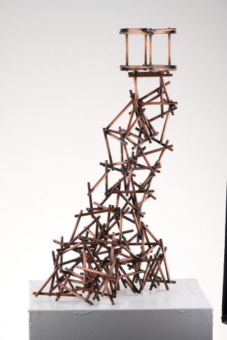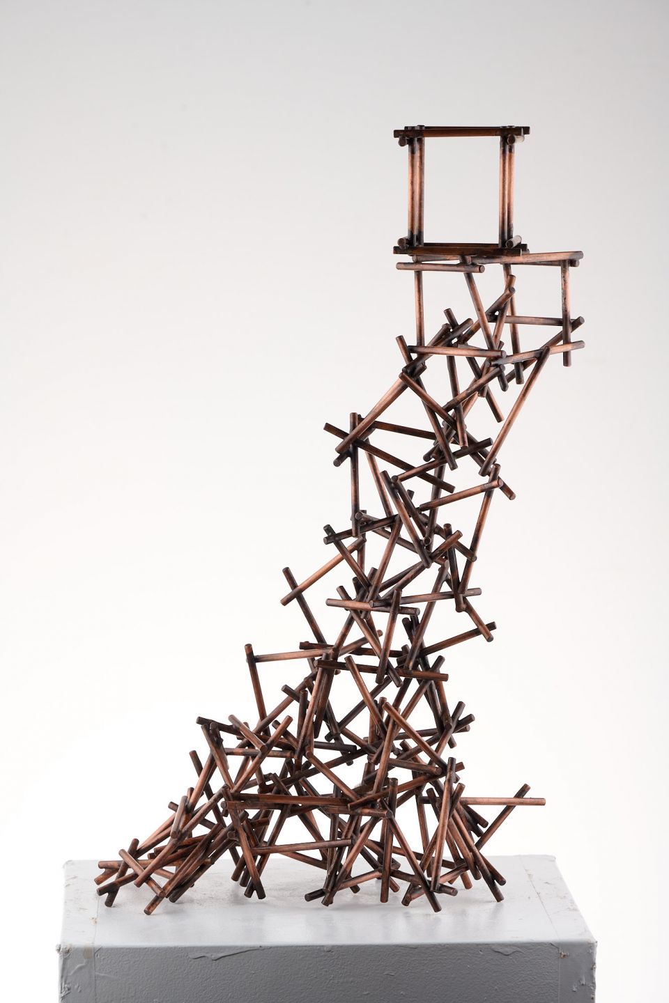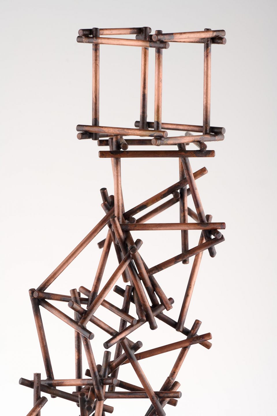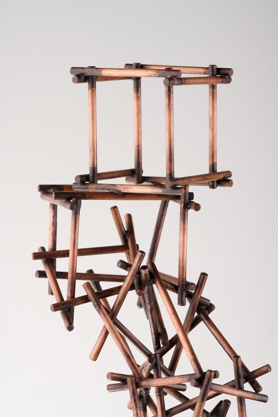 A chaotic jumble of copper rods gradually resolves itself into a rational shape.