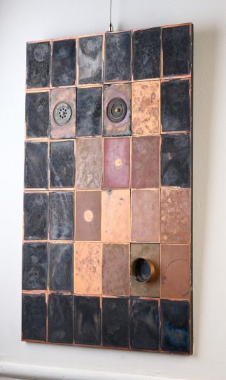 Heat, pressure, water and atmospheric chemicals all affect the living metal that is copper. Identifying and arranging this oxidation is my artistic practice. Each and every piece is unique and still in the process of changing. Colours and patterns which often mimic nature are of great beauty to me. Both brass and copper elements which have lead former lives in industry are my source of inspiration.