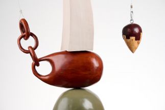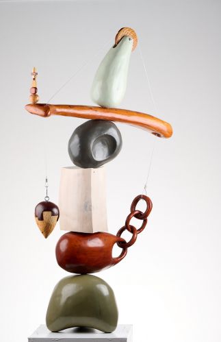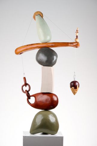 This piece creates the tension of balance through delicately placed solid forms, balanced on top of one another in a seemingly precarious fashion. The chain links in one of the forms plays with the idea of the material as a solid form. The wire that keeps the chain elevated is counterbalanced by the weight on the other side adding to the tension of the piece.