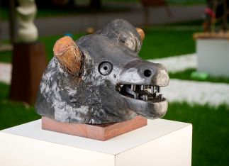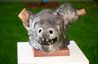 A burl from an old eucalyptus added to and carved to a naturally suggested form of a beast.