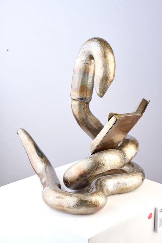 - Media: Welded mild steel sheet, 40mm Steam pipe bends and straight tube, textured with a carbide burr, Brass label and 2k clear coat.
