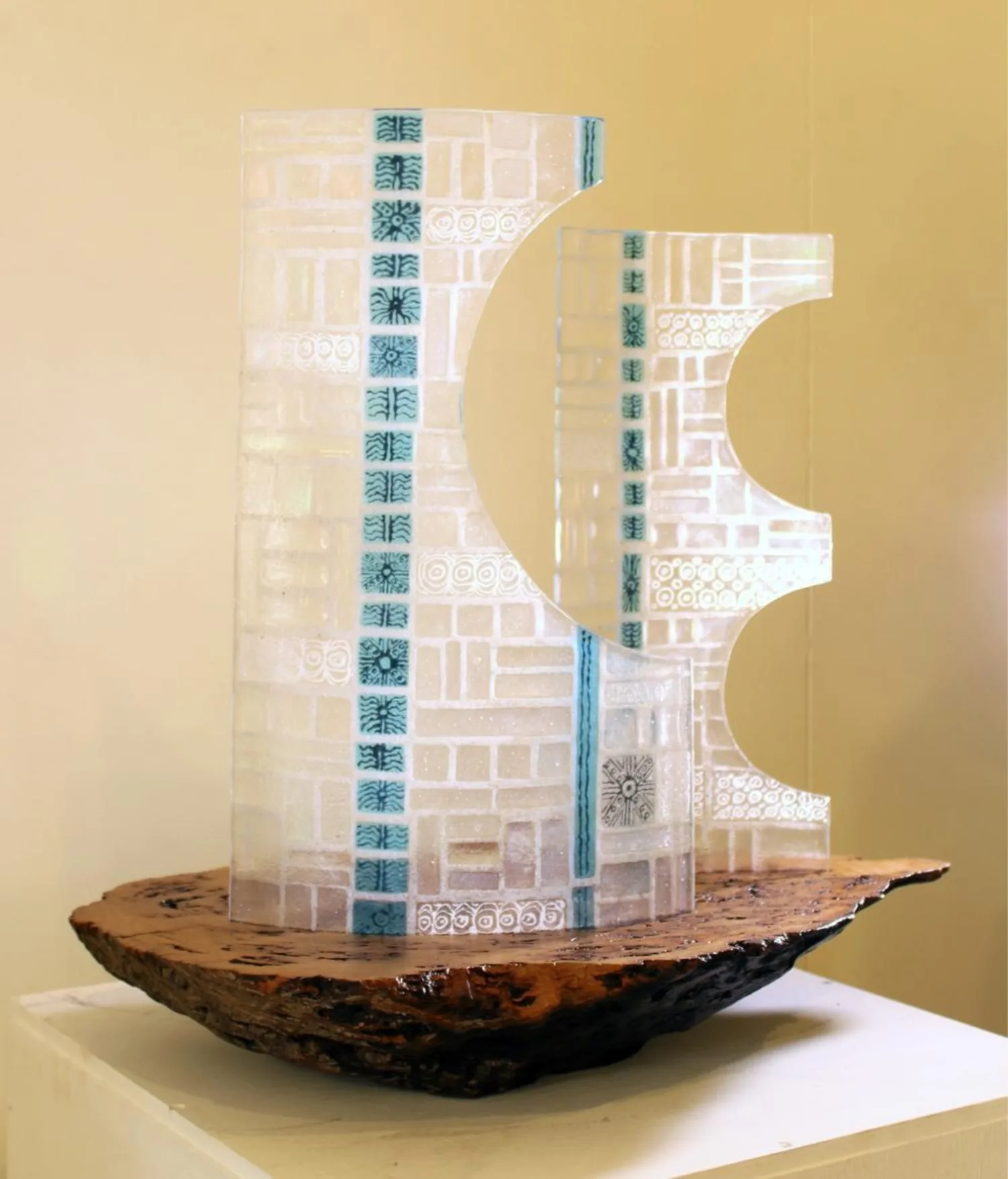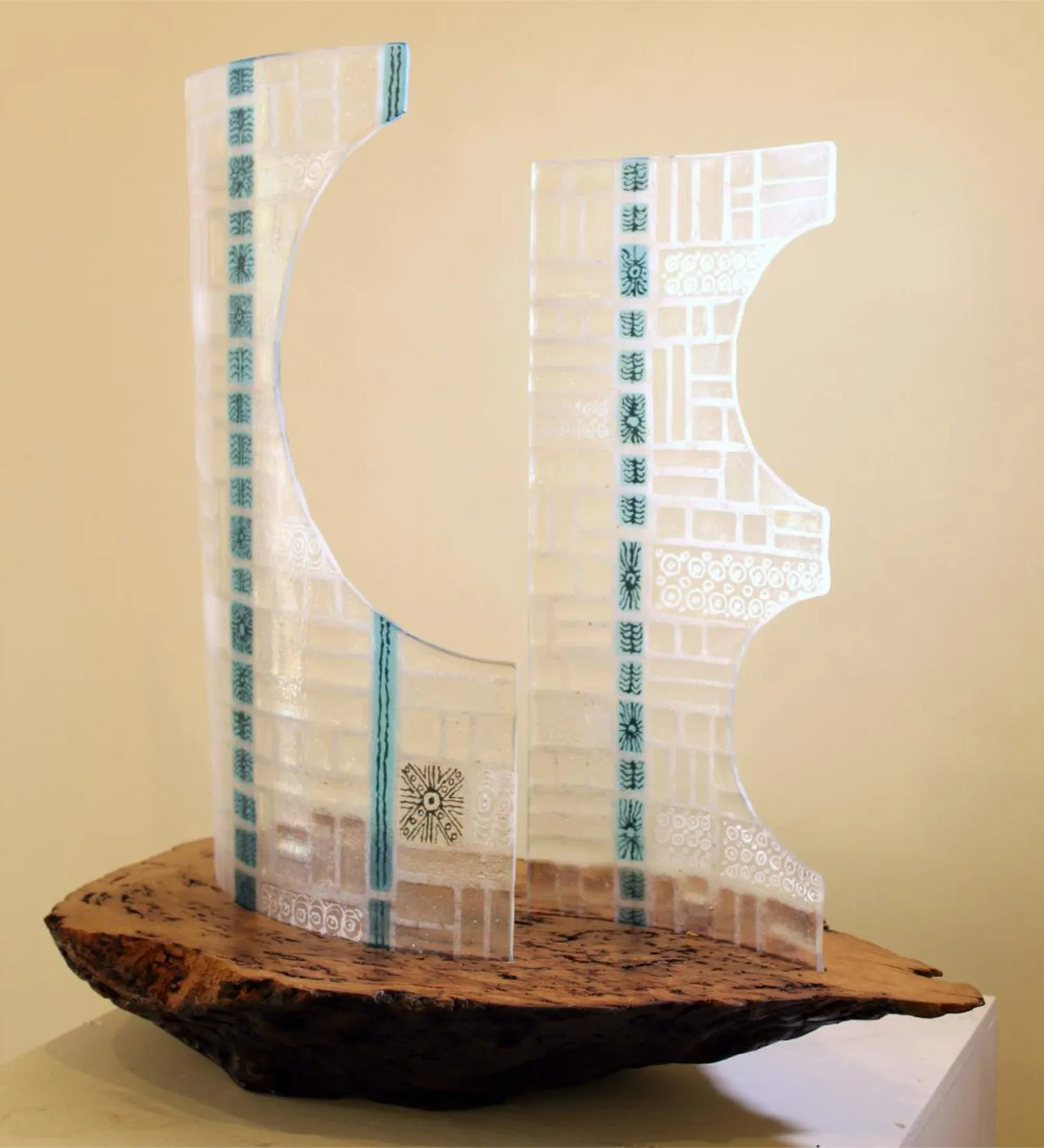 Boat Essentials- This work takes the shape of a natural wood burl and develops a representation of a boat with the addition of symbolic glass sails. Conversation- As the name suggests the piece is the output of two artists regarding the nature of their respective mediums. We wanted to create a relationship between them.