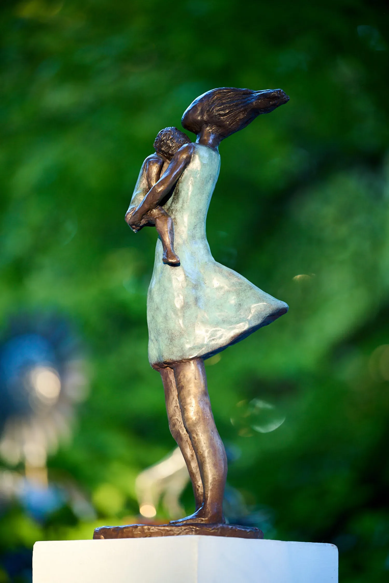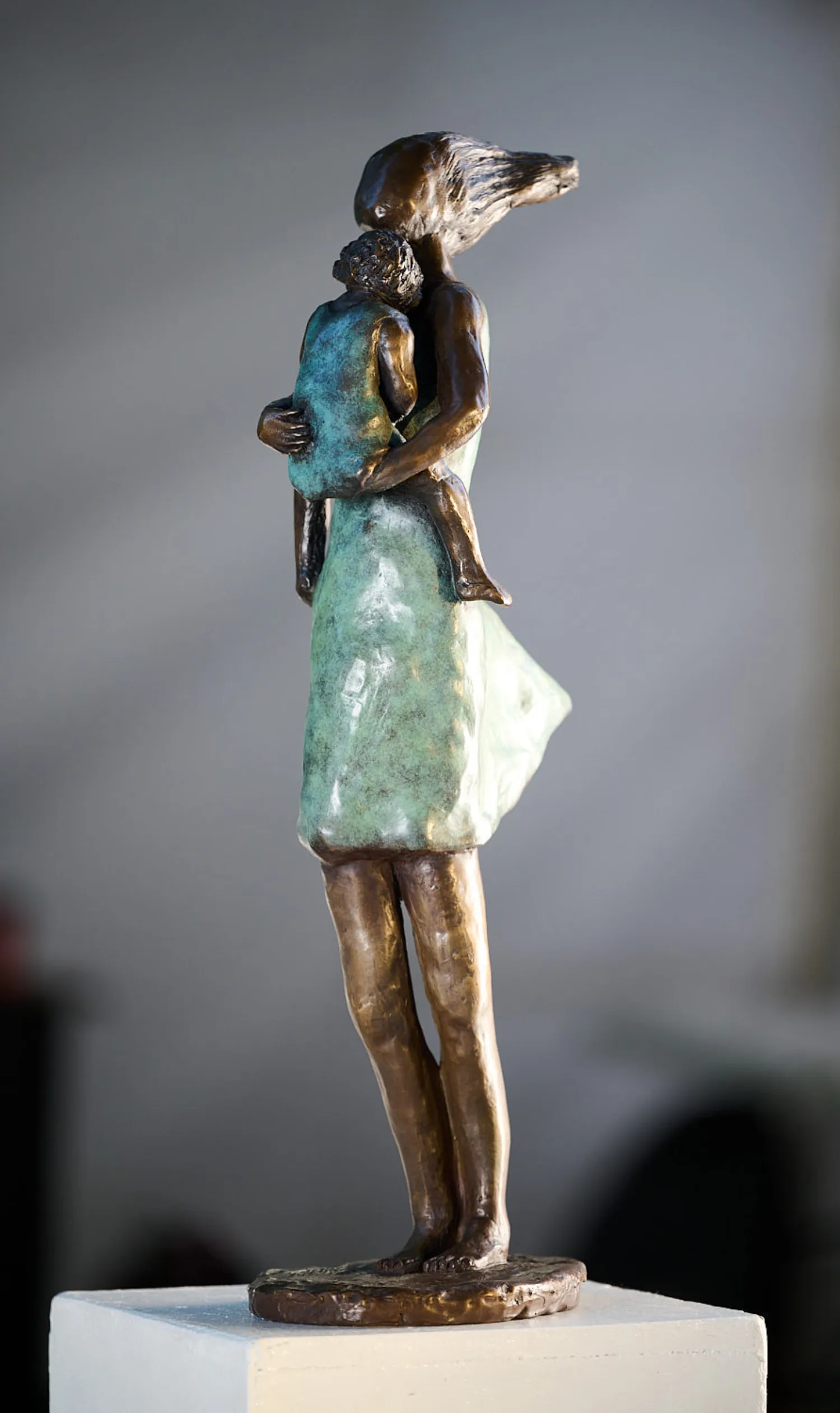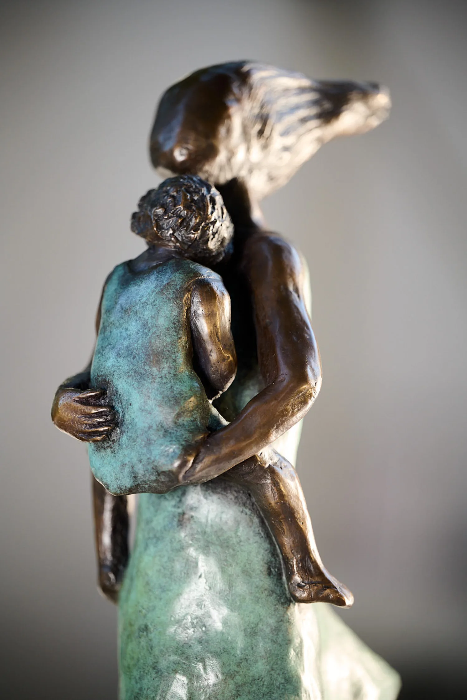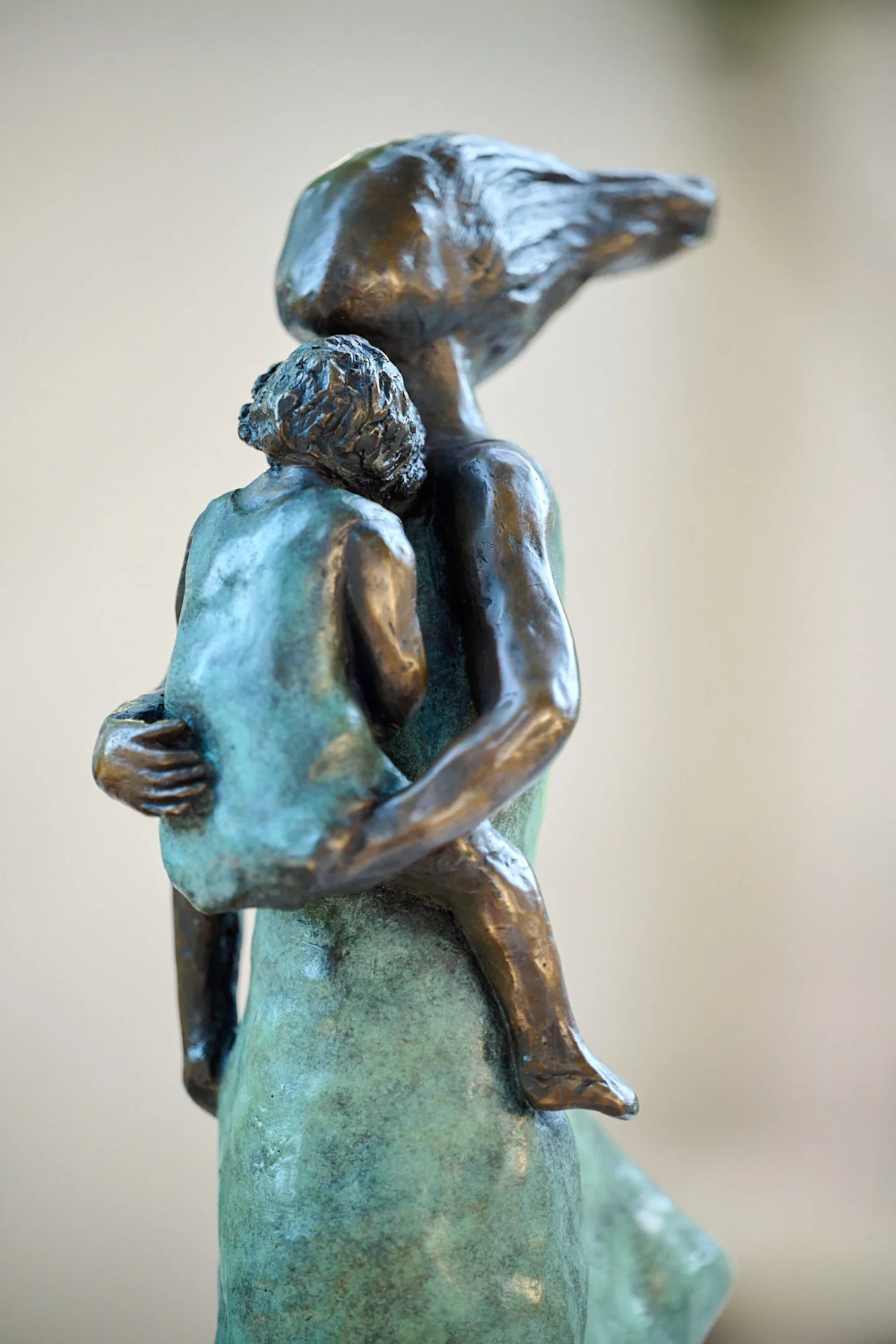 This stunning bronze sculpture showcases exceptional skill and technique, capturing the emotional resonance of the bond between mother and child. The artist’s nuanced use of form and material elevates the piece, employing the power of suggestion to create an evocative narrative. Through subtle detailing and expert craftsmanship, the sculpture allows the viewer to connect emotionally with the piece, as the form seemingly transcends the physical, creating a greater sense of context and universal story.