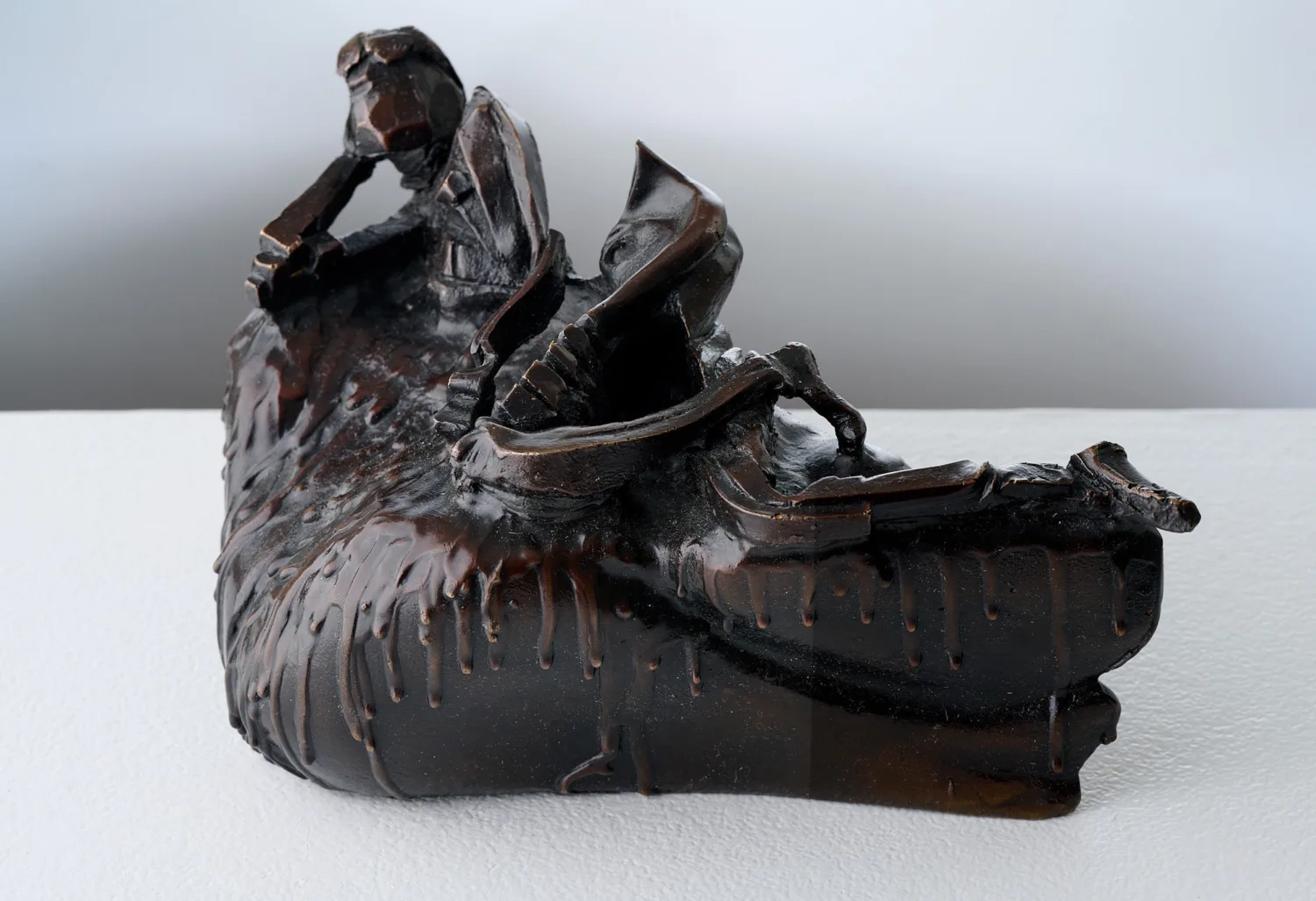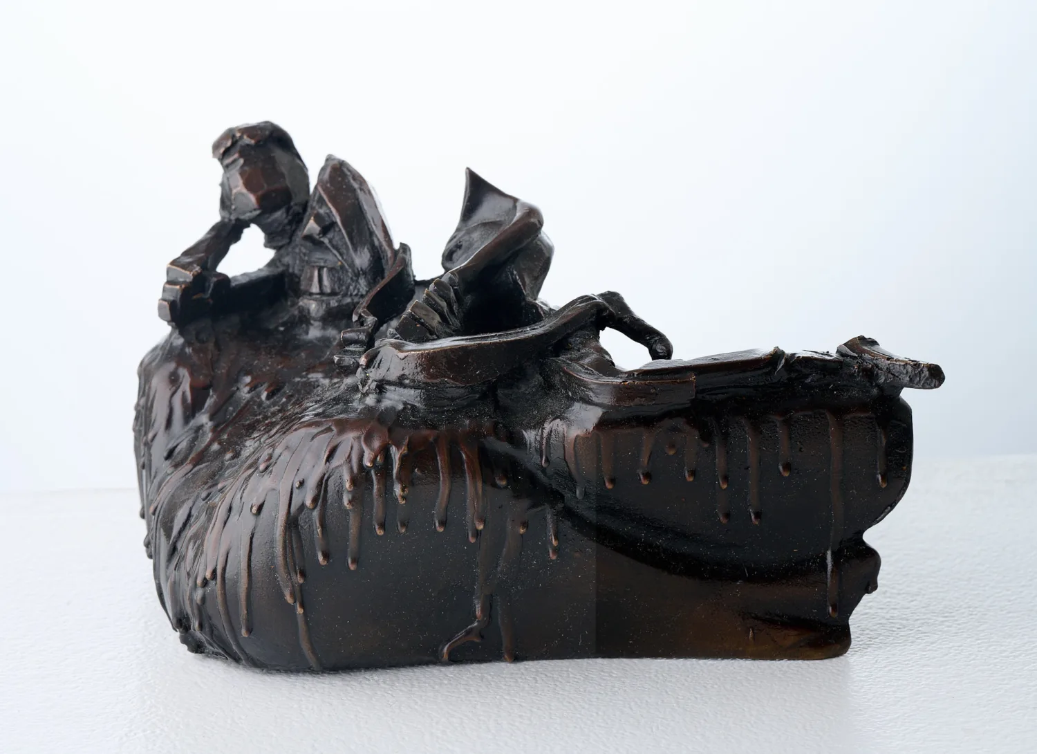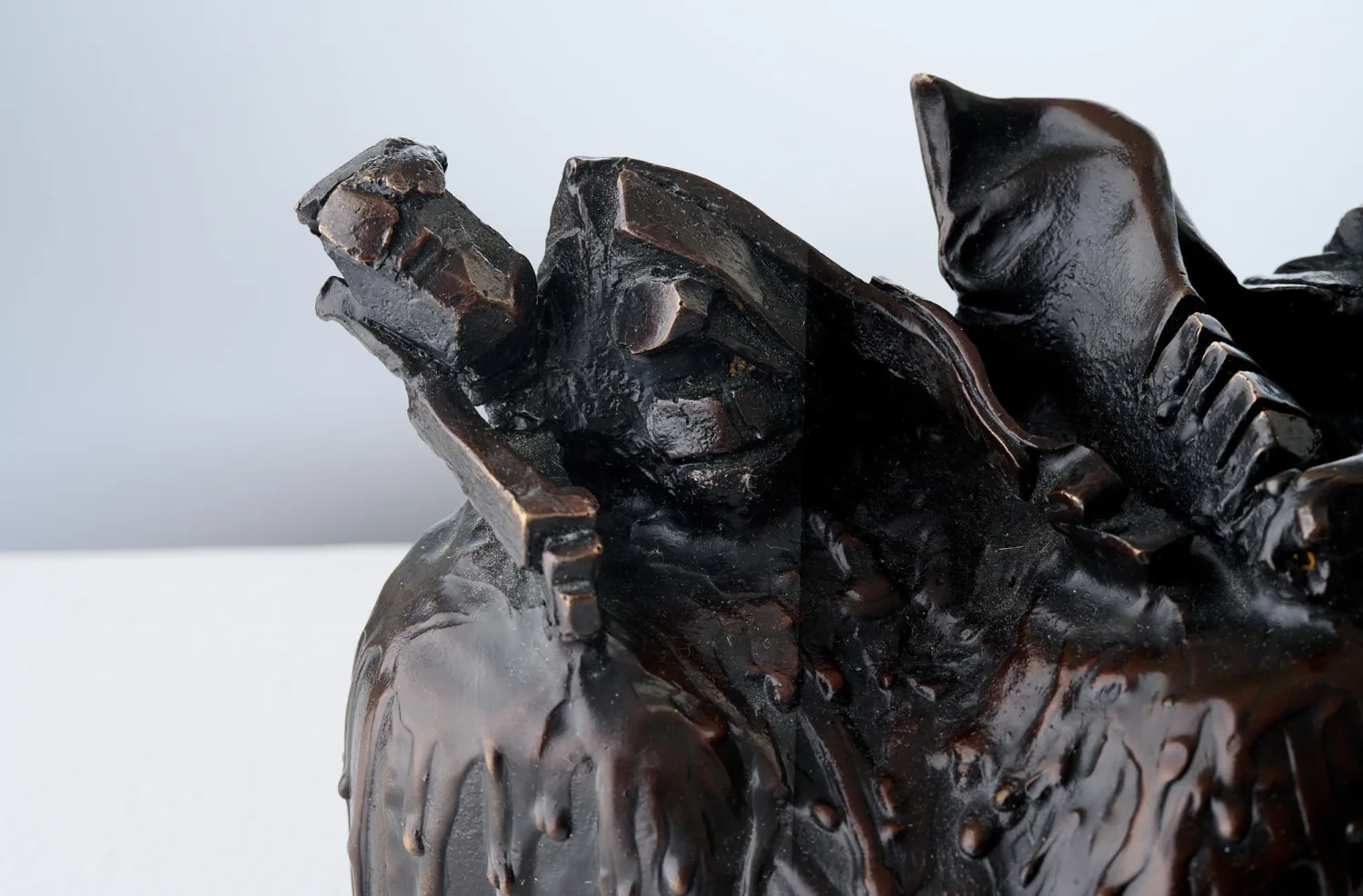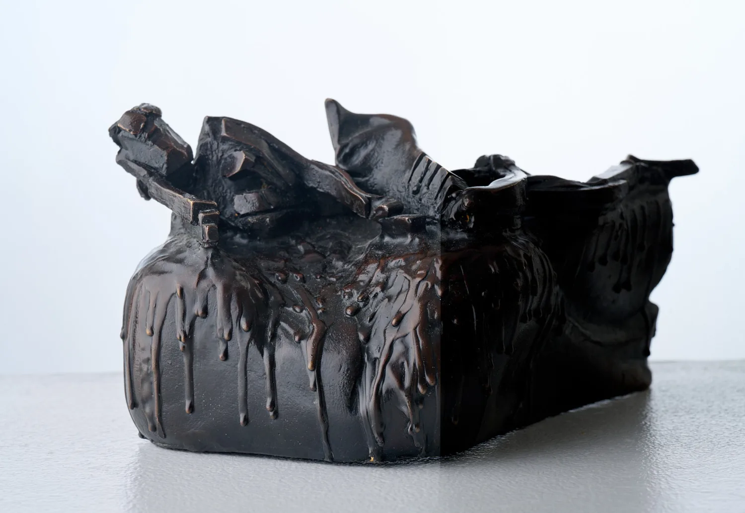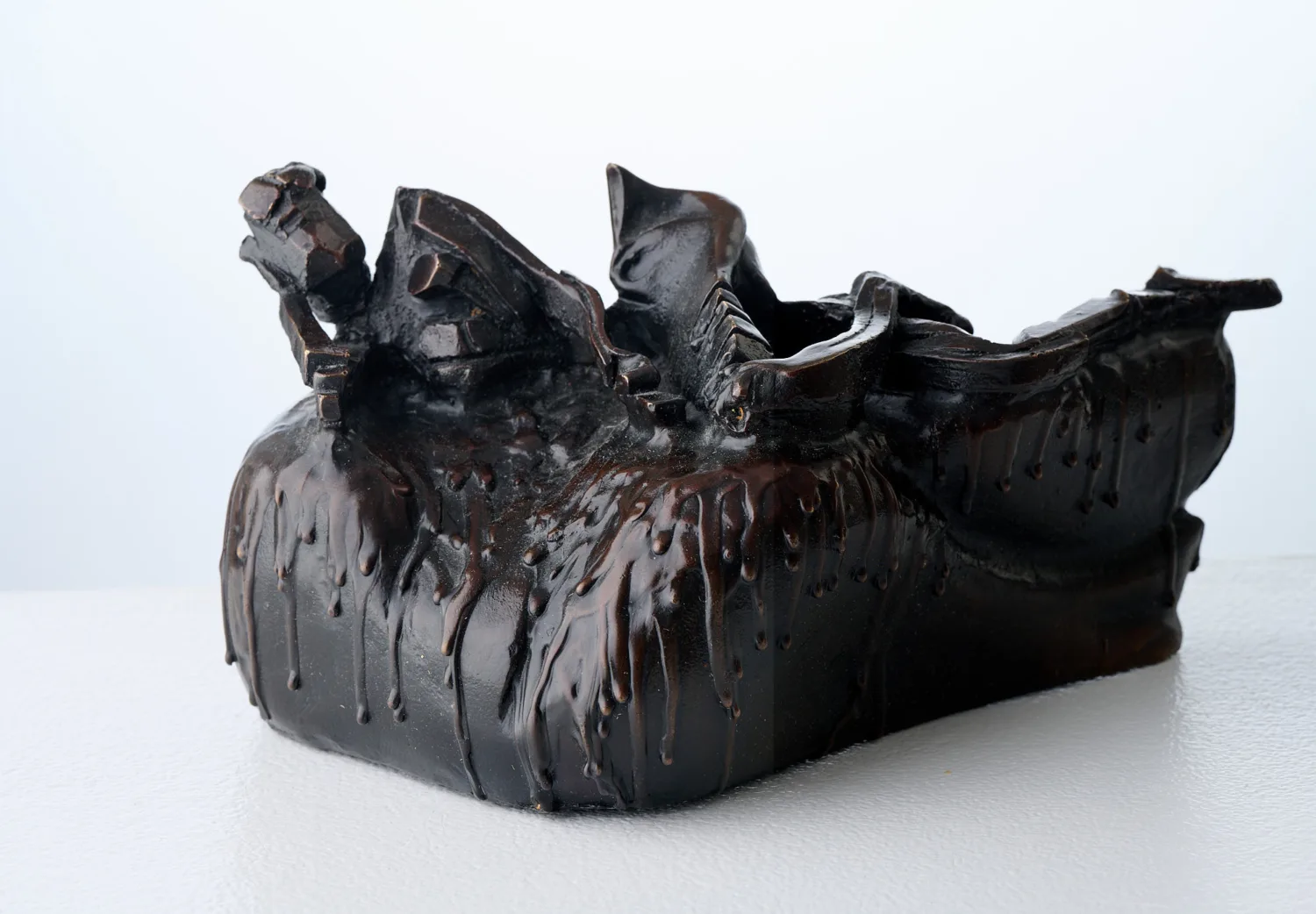 An eerie twist on the classic reclined nude. Drip Lick strips this sharp figure back to her mechanical and raw core, an organic and fluid base supporting her. This artwork was made from studying a live model in wax. The wax was cast into bronze and the base carved from marble. Then, Ioanna made a silicon mold and a full wax version in order to work directly into the wax with heated tools. This technique brings you details such as the drips on the full form of the base. Drip lick was created in 2020 during the first Melbourne lockdown in a sharehouse of artists based in Prahran.