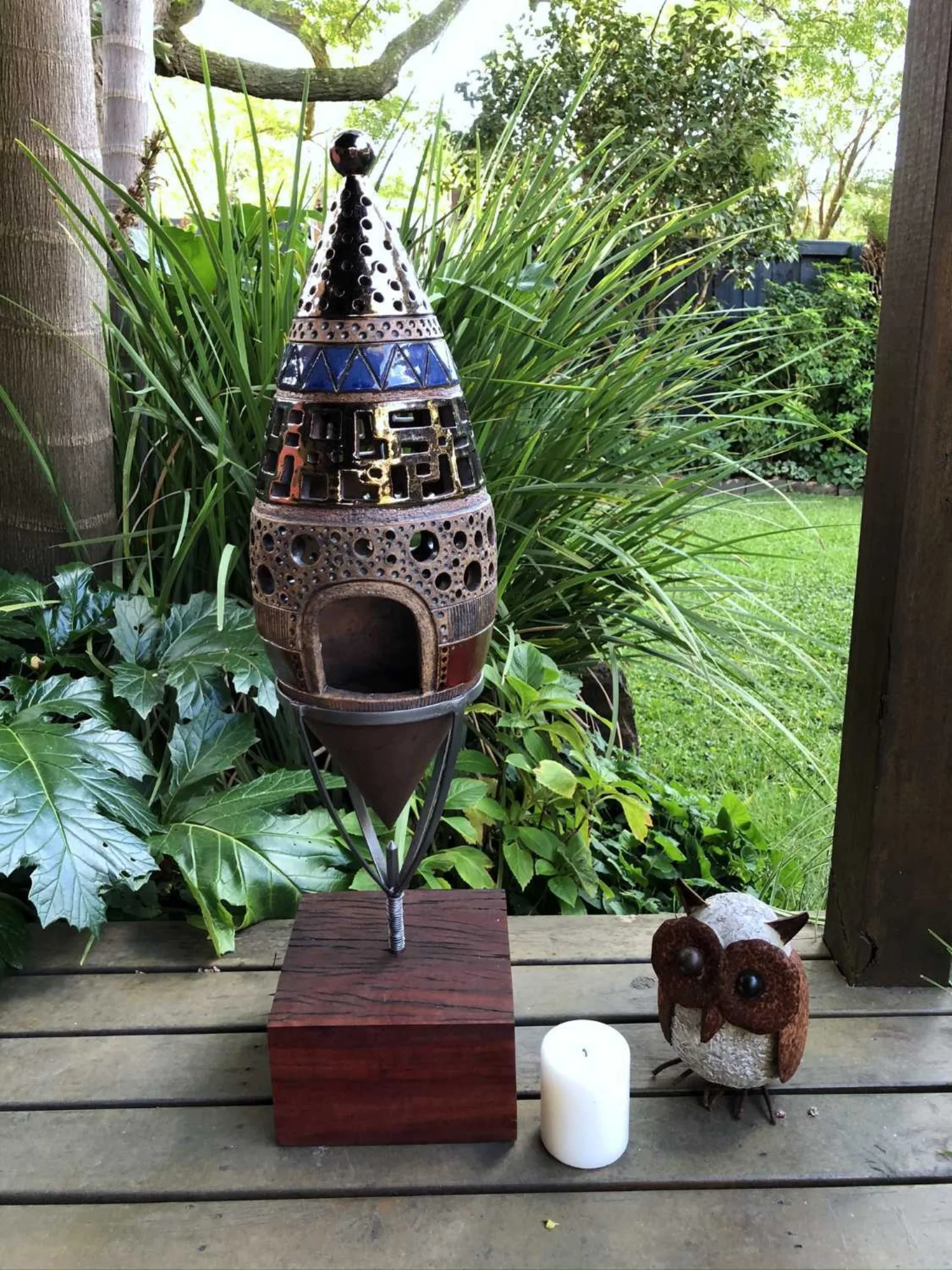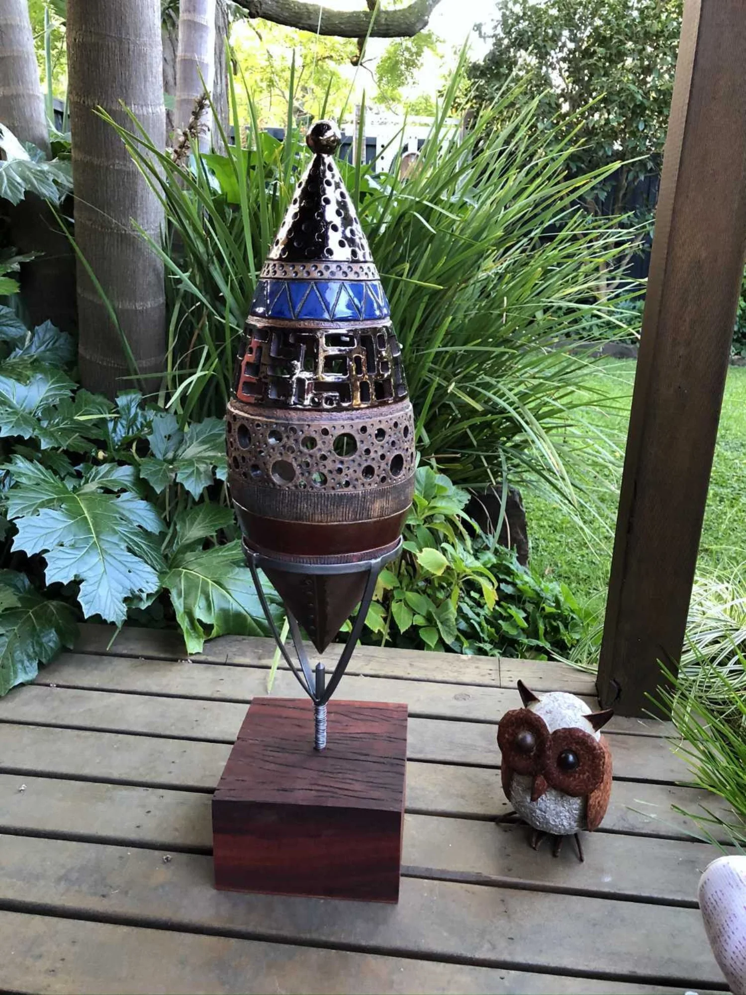 Ceramics and sculpture have always been a passion of mine. I started doing pottery in South Africa, which has had a large influence on my work. I love to stretch the boundaries of combining clay, wood and metal to create my sculptures. It is good therapy for mind and soul, giving me a great sense of achievement. The boundaries are endless. I have created “FLARE” to enhance the serenity of any outdoor / indoor area. This creation comes alive when it is illuminated by adding a candle or light inside the base of the sculpture.