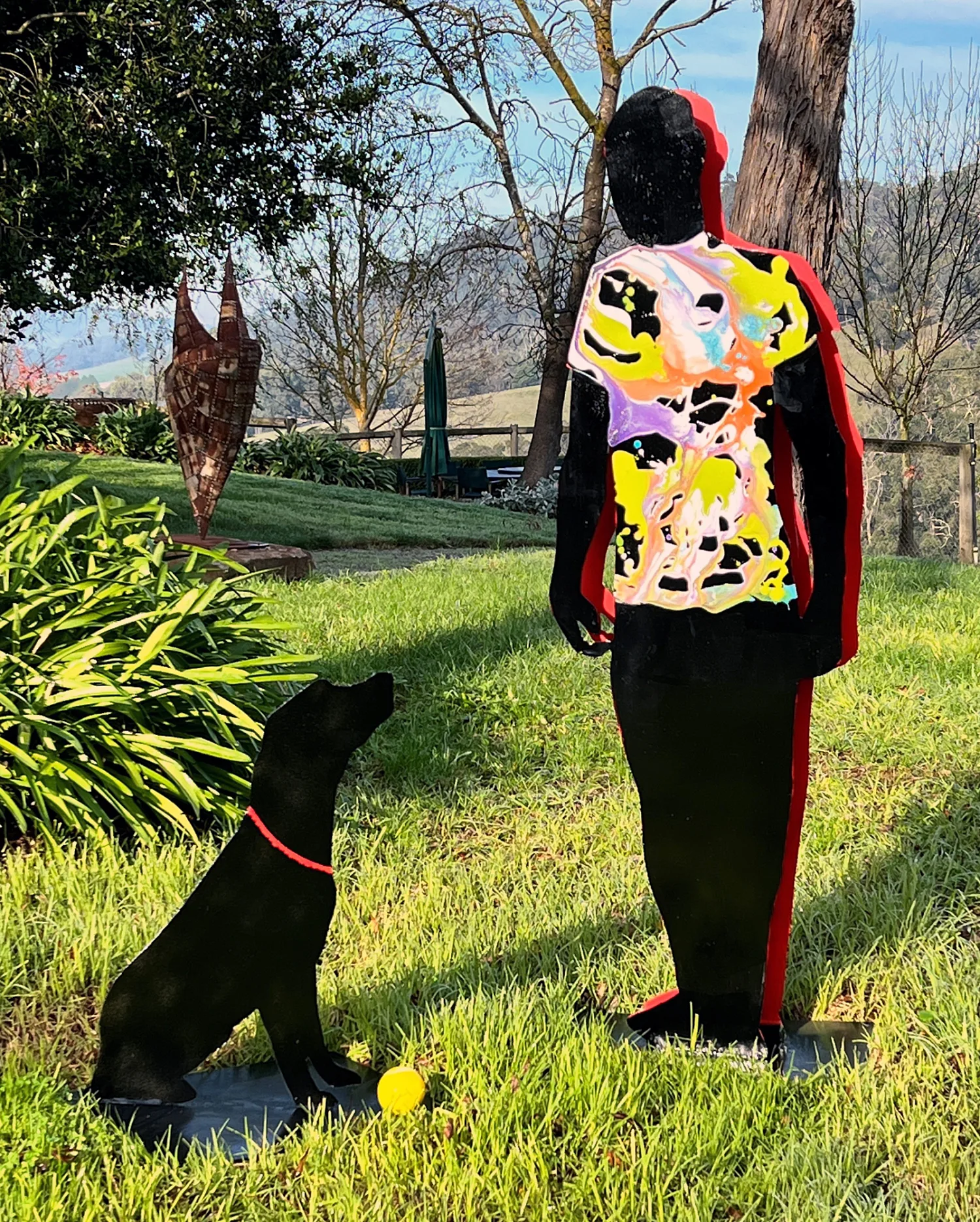 During Covid lockdowns it became screamingly obvious how important our pets are to our physical and mental well being. We all believe that we "train" our pets to behave in certain ways but in fact, it is the opposite that is more accurate. Our pets teach us all sorts of life lessons and behaviours. They understand more about human emotions than we often give them credit for. They are adept at manipulating us to make sure we understand their comfort and needs and our lives are better for it. Jenny Reddin seeks to portray snapshots of life in metal silhouettes that she paints to describe attitude, personality and expression. She is inspired by everyday experience and the power of body language.
