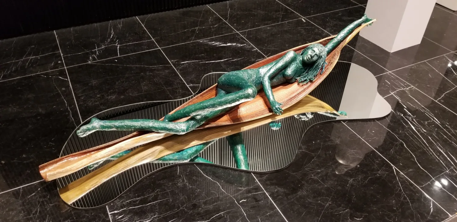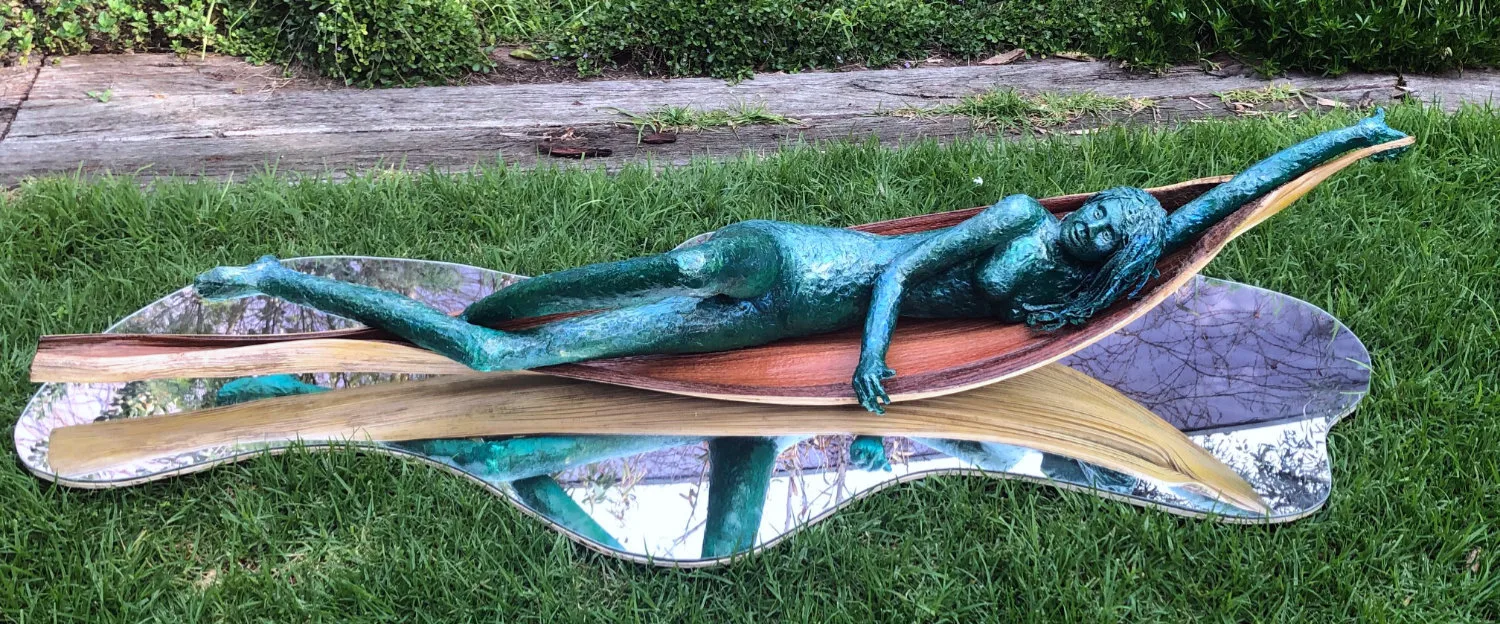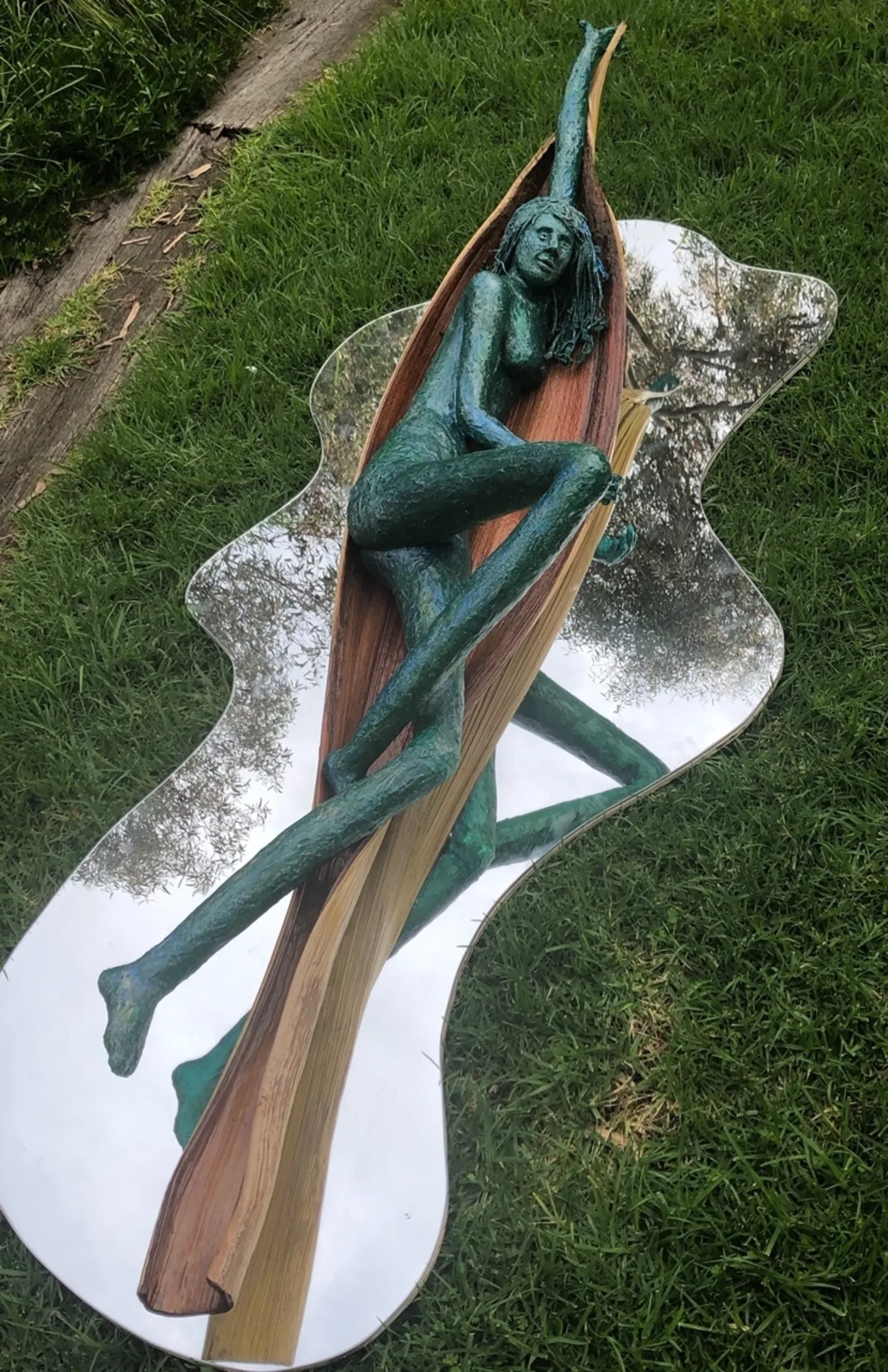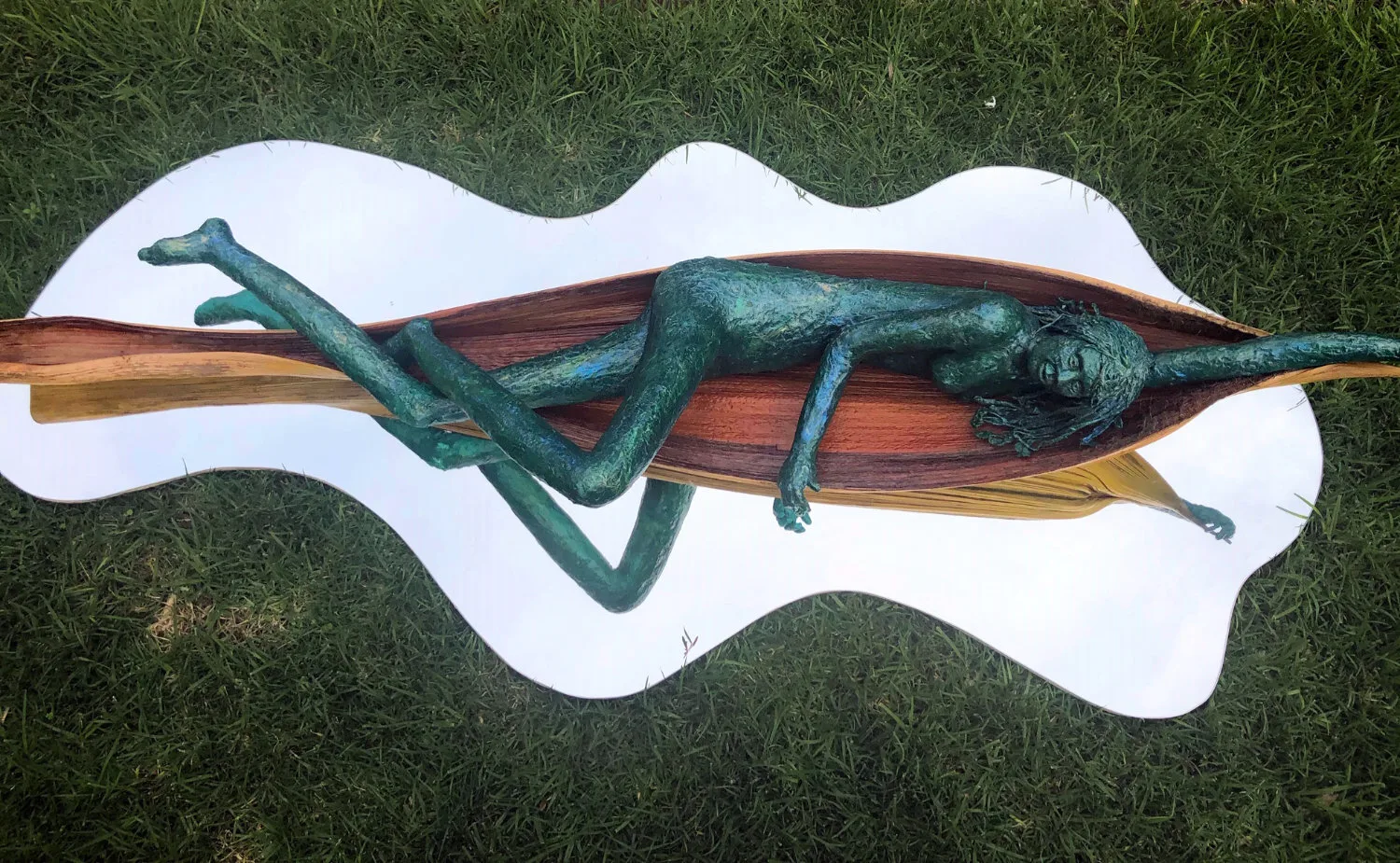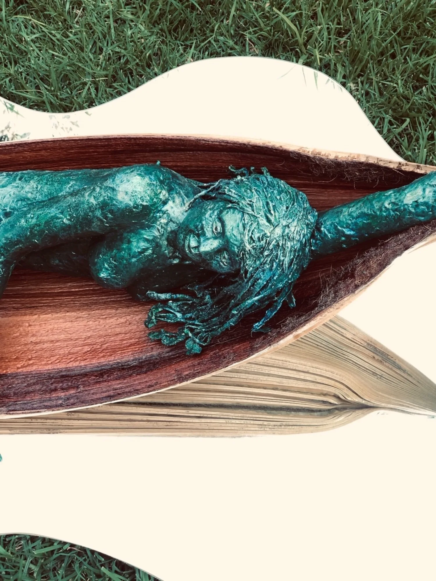 Human Bean is reminder that we are part of nature – just as much as than any animal or plant you might meet, see or eat. I created a mystical figure that might be found emerging from the giant seed pod – as if the pod and its contents had fluttered down from a tree and onto the river below, to float languidly along its surface like the lady of shallot (or spring onion!). This is a whimsical, humorous, gentle prod that we should not take ourselves too seriously, and not forget that we are an intrinsic part of our beautiful, natural world.