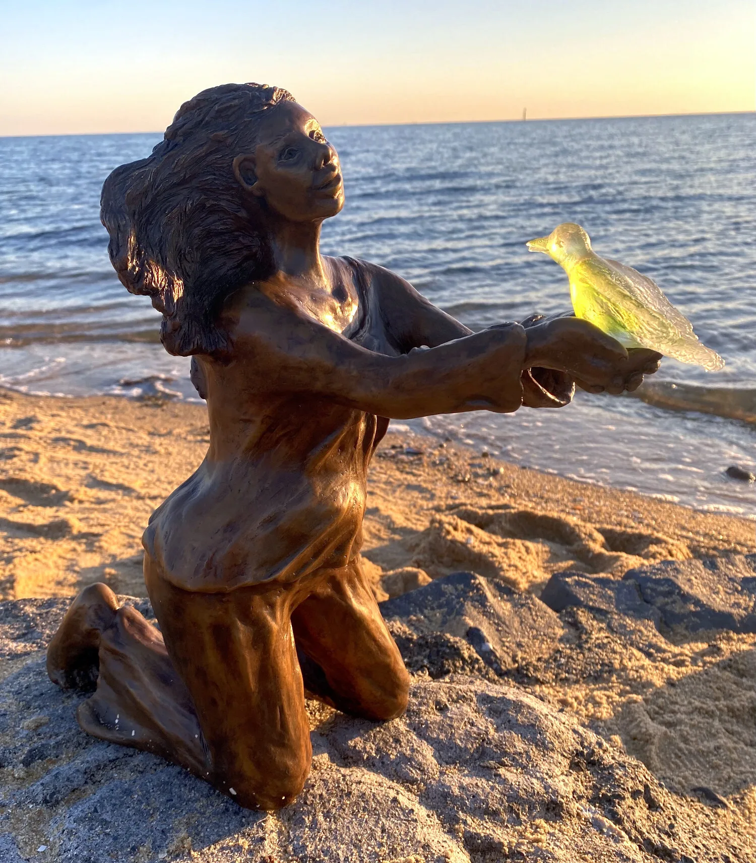 Imagine, for a moment, the most glorious beach. The water is sparkling as you walk barefoot in the sand. While you look around at its vastness, you see the most amazing, colourful bird in the sky. The bird flies right up to you. You hold your arms out towards the bird and, to your astonishment, it lands right in your hands! You drop to your knees, careful to balance this new friend. You feel the connection with this beautiful, powerful creature. This sculpture is an allegory for our relationship with nature and wildlife - so precious, beautiful, mysterious - and fragile. A responsibility we hold in our hands; as well as a treasure to nurture and celebrate - how lucky we are!