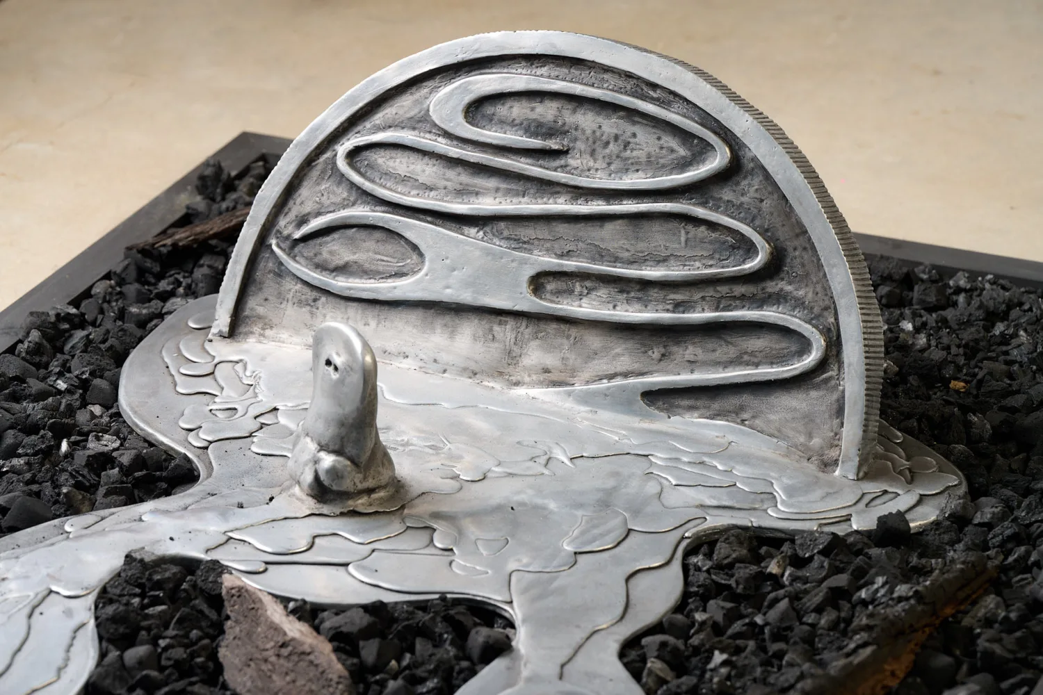 Both the existence of Australian fauna, such as the platypus, and the twenty-cent coin are endangered. The coin, by the inflationary economic development, and the platypus by the associated environmental collapse. In " Liquidity" molten flow patterns from a twenty-cent coin, partially melted by bushfire, displace the dying platypus into a bed of coals and burnt logs sourced from bushfire sites. An accompanying augmented reality video of the platypus will be accessible by smart phones via a QR code and locates the video into the site.
