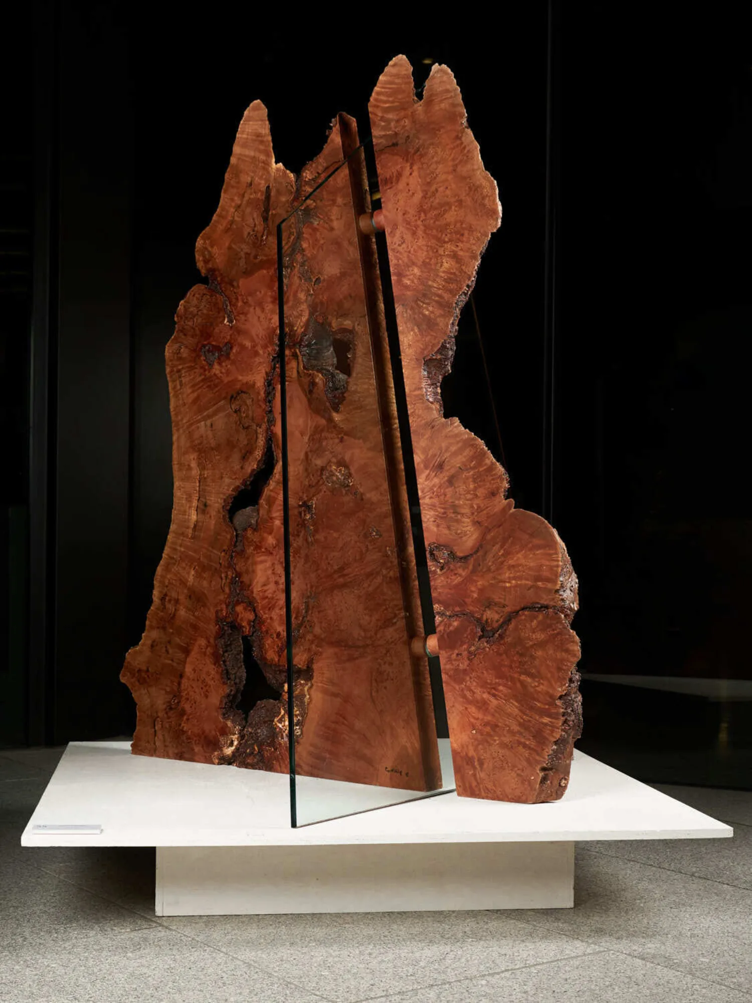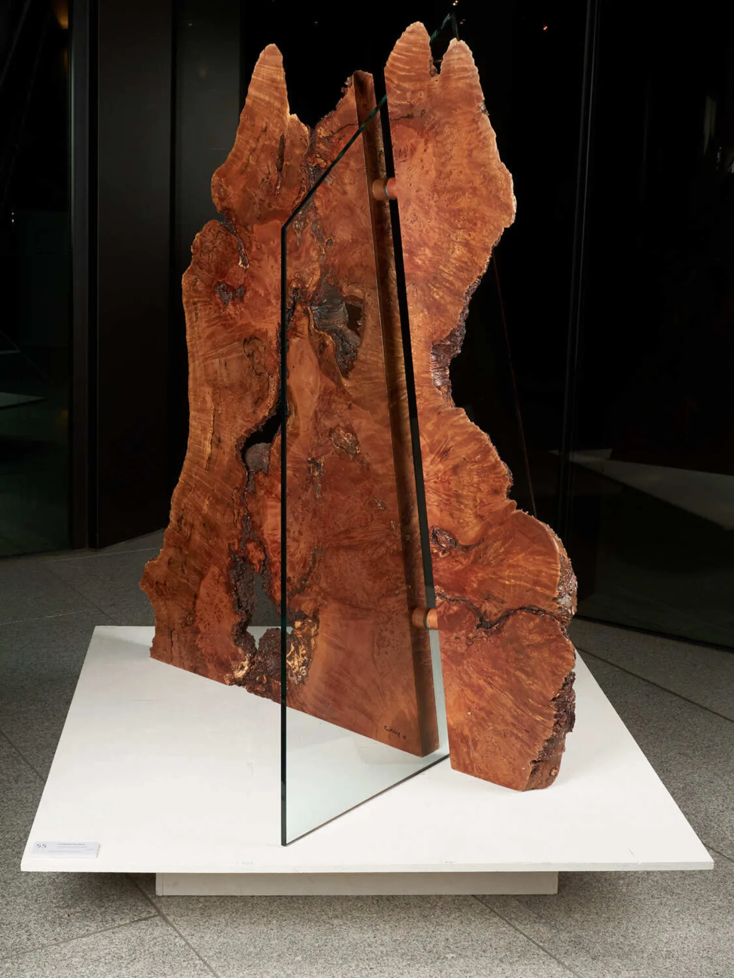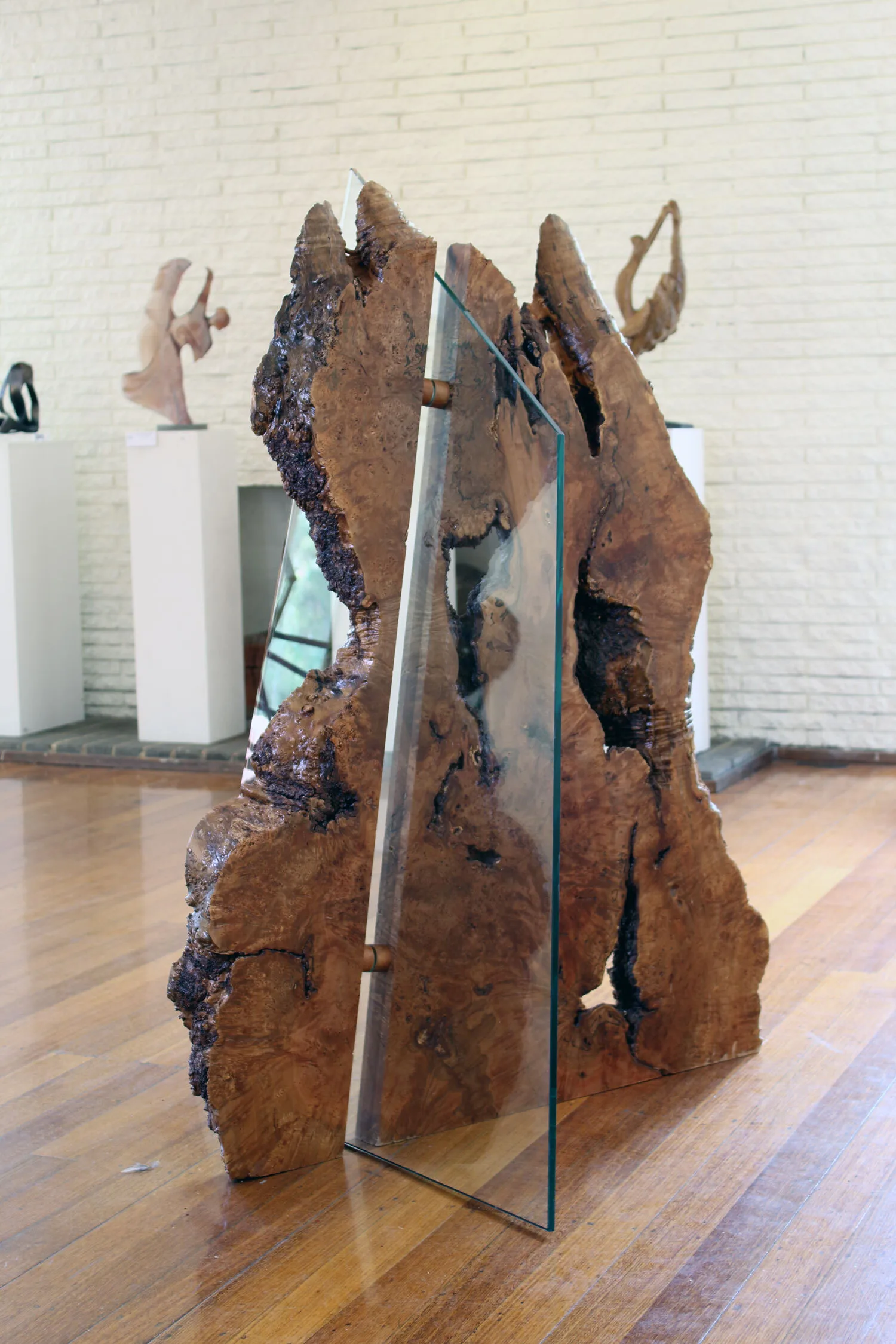 Crossed Section is a metaphorical work which uses the intricate patterning and form of a section of a myrtle beech tree to represent the natural world and glass to represent the destructive activities of humanity. Prior to its destruction the tree was a living record of its environment for hundreds of years. This work attempts to present its narrative as a way of raising environmental awareness in the viewer.