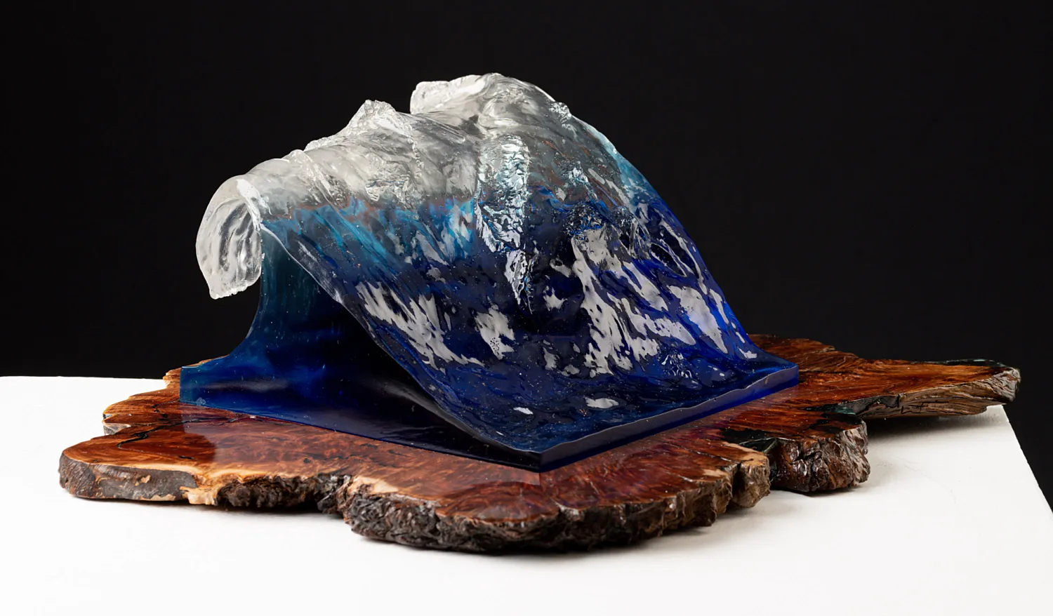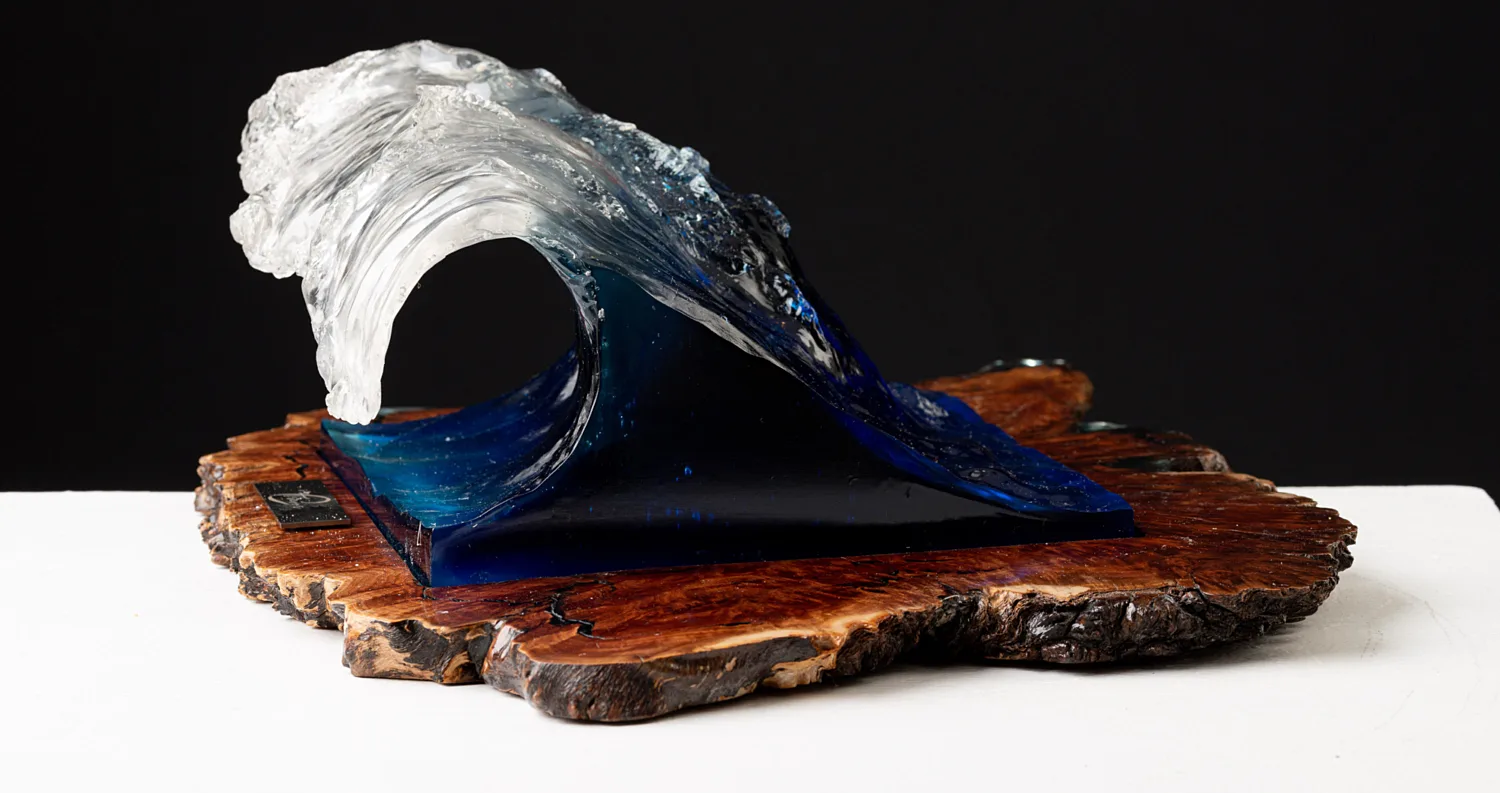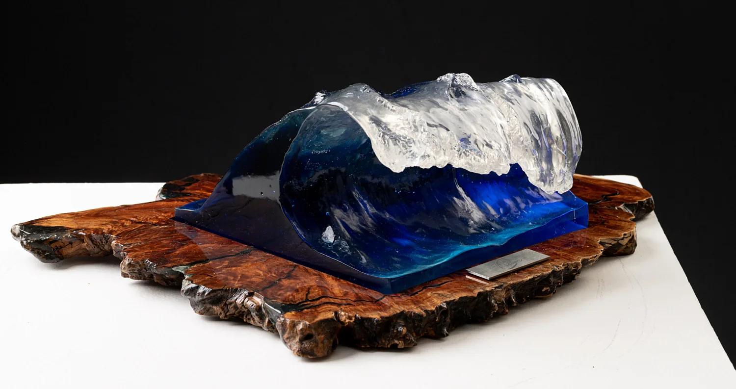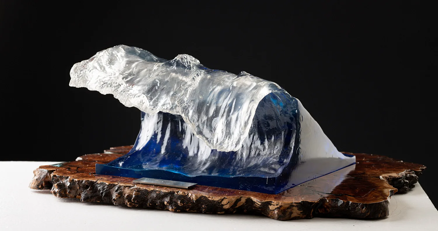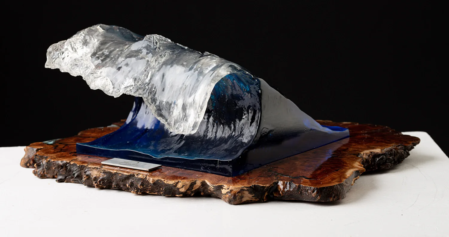 In a year of devastation, challenge and loss, the beauty of waves on the shore can remind us that whilst turbulent, unpredictable and confronting. Waves ultimately dissipate on the beach allowing us to clearly see the horizon once again. Formed from an original clay sculpture, then cast in a crystal clear resin layered with azure, turquoise and royal blue pigments to react prismatically with the light, base wood Australian Gum.