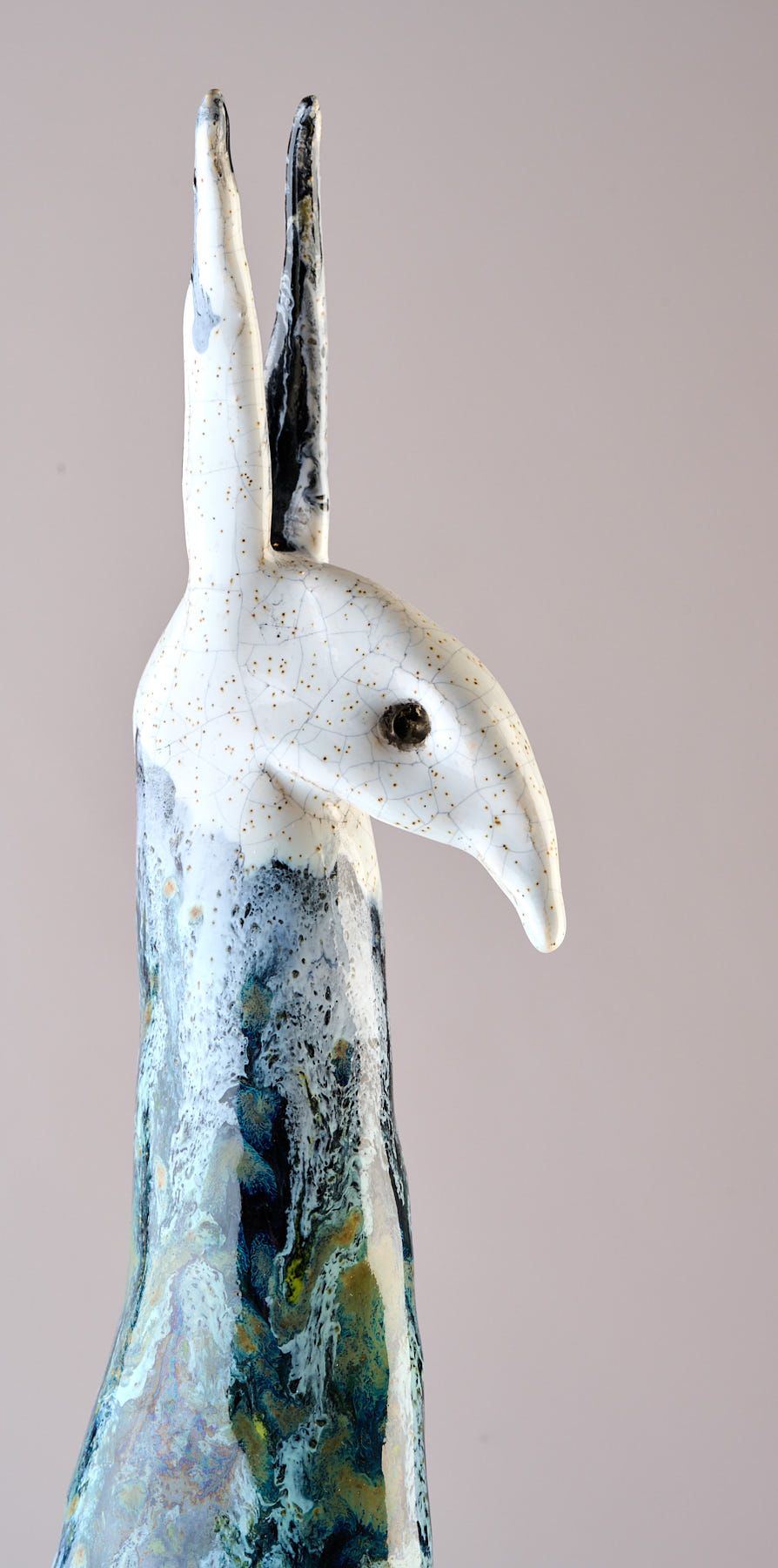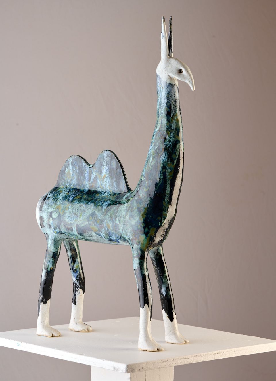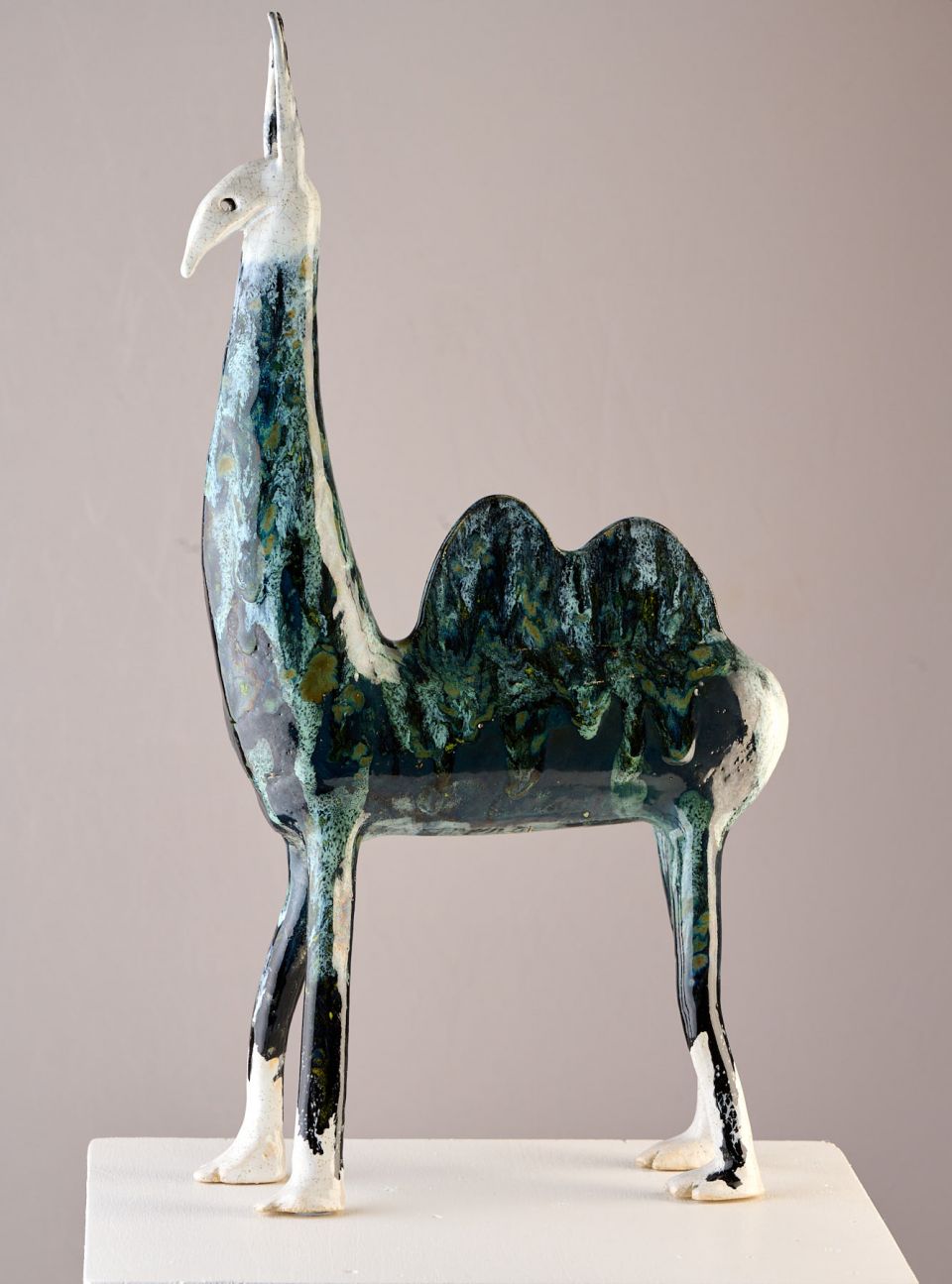This piece celebrates the camel’s goofy elegance and stubborn charm. Built for extremes, camels drink once, then trek for weeks—unbothered by sandstorms, time, or anyone’s opinion. One toe down, this particular camel moves with even more character, proving that missing toes don’t mean missing the point. Their loping stride, tilted grin, and centuries of survival are all here in form and texture. Their shimmering glazed humps offer a mirage to the future. Camels are weird, wonderful creatures that remind us: you can carry a lot, walk your own way, and still get where you’re going.