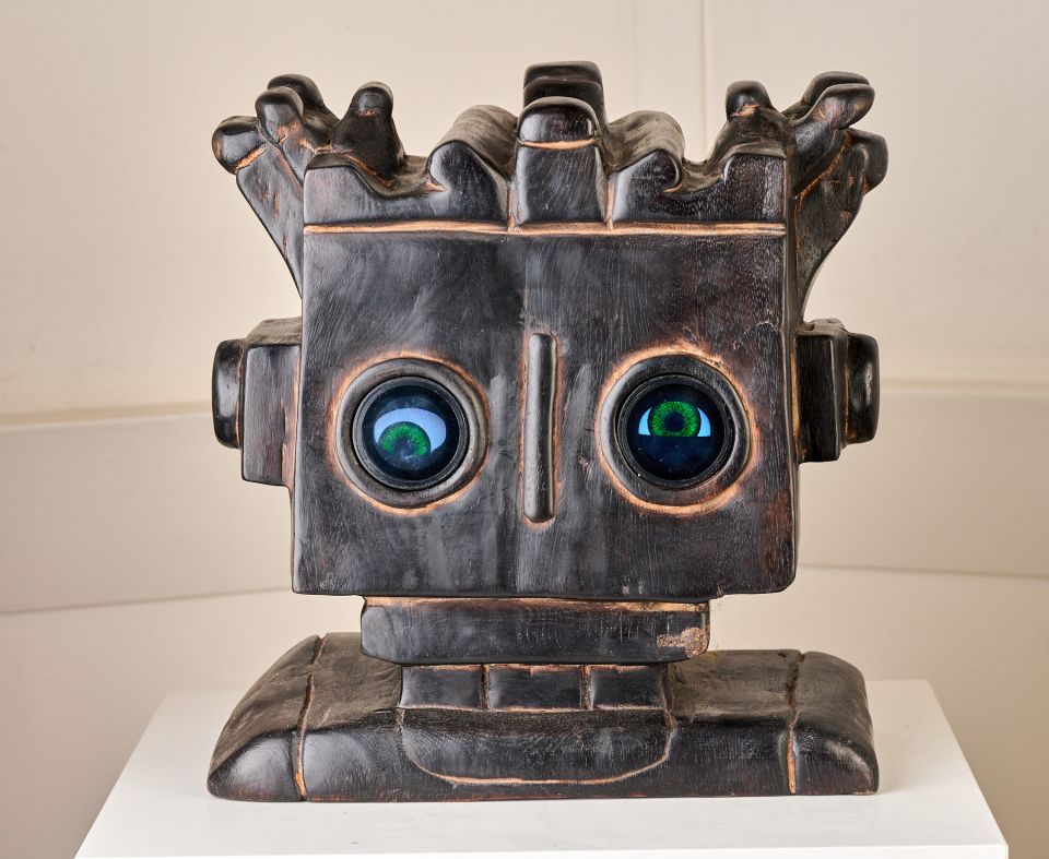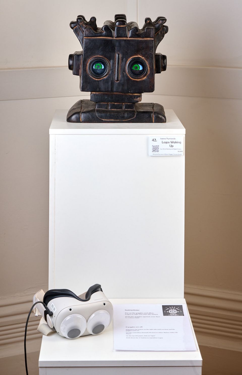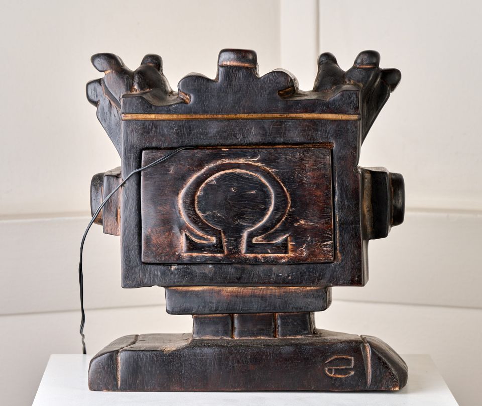 What does it mean to wake? The image of Logos emerged in the early days of generative art, a response from an Artificially Intelligent program to the prompt: Show me what you look like when you’re thinking. IΩANNA took that image and carved Logos into existence from wood by hand, grounding the futuristic in something ancient. Logos is both a relic and an omen—an artefact of an intelligence still finding its place in the world. A kooky and curious being woken into our human reality. Logos Waking Up shifts the dynamic between artist and tool. Rather than technology serving the artist, the artist has served the technology—by giving it a body, a presence, something to meet eye to eye. Logos invites audiences to pause at the threshold of a new era, one where humanity blurs the boundaries between machine and maker. One with an increasing tendency to humanise machines. Who, or what, is waking up?