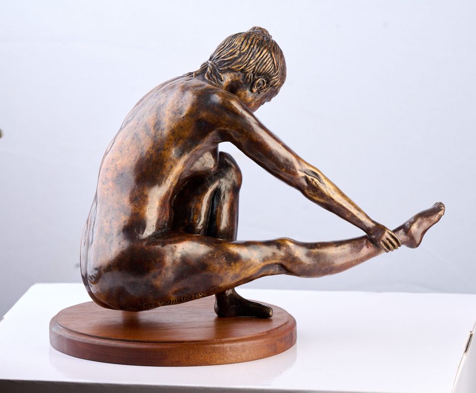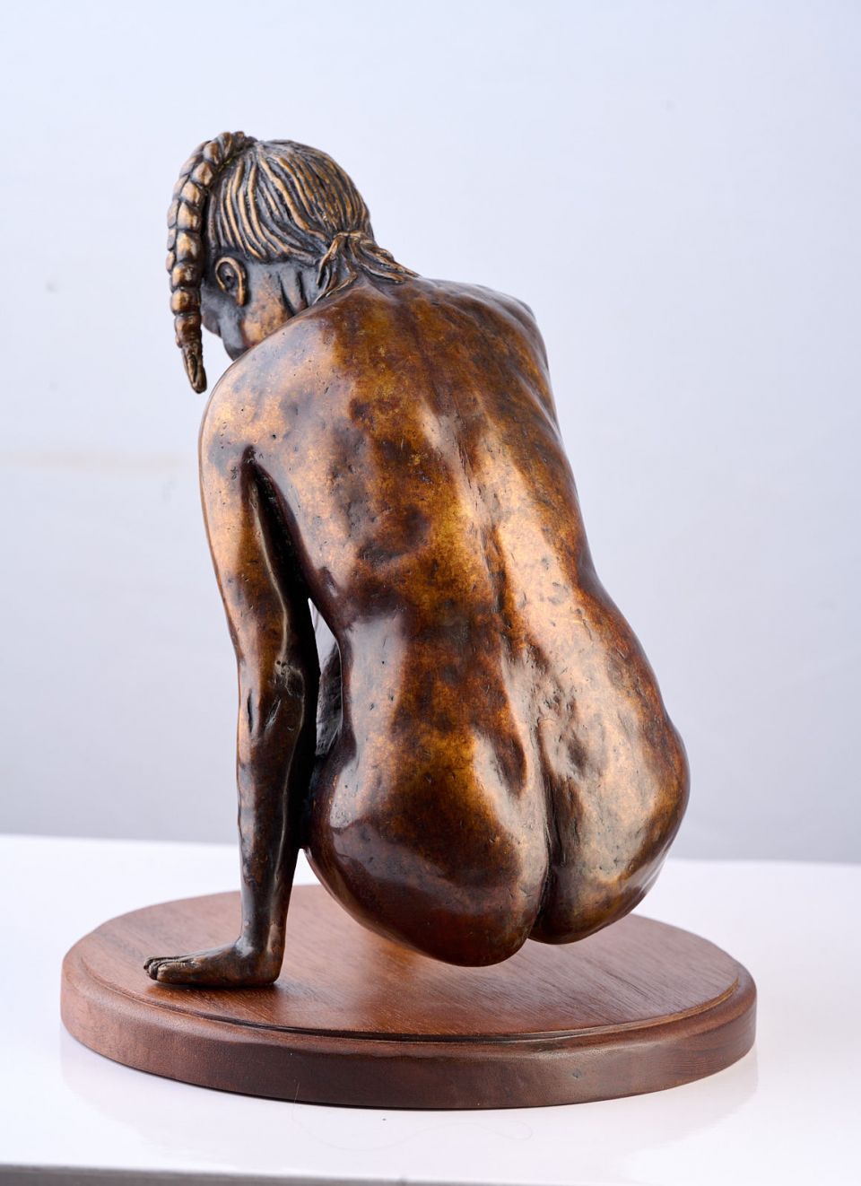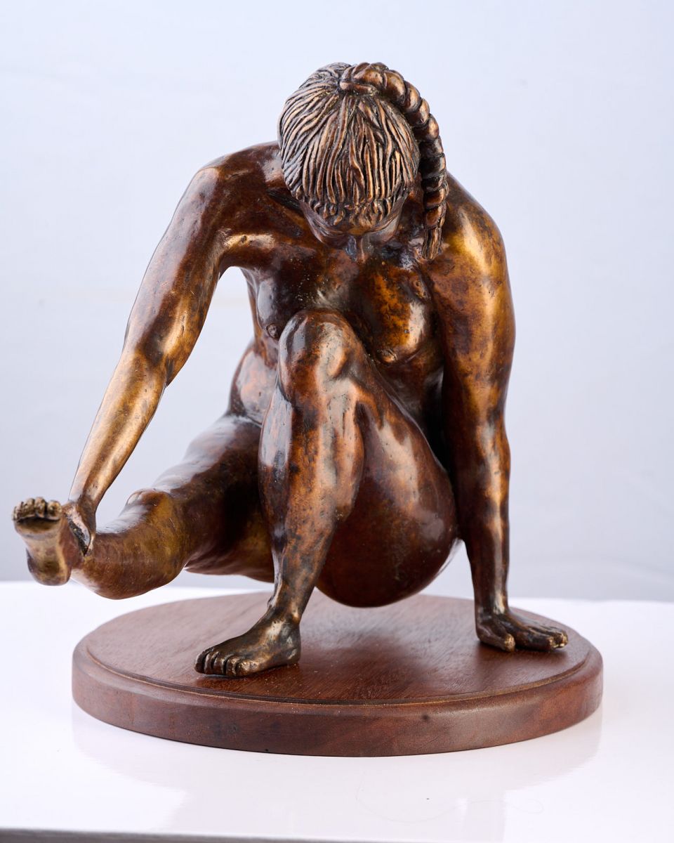 For me, 'Rebekah' represents discovery and family. I wanted to discover and learn the process of making a bronze sculpture - from clay, to wax, to bronze and all the steps in-between. With two sculptor ancestors, I was curious to know if they could ‘whisper’ technical secrets to me from the past ... is sculpting in my DNA, and could I too become a sculptor! This is my first bronze. Modelled from life. @ 1/4 life size. The pose shows the balance, flexibility and strength of my daughter. It sits on an African Walnut circular base. The wood came from family furniture made in Nigeria, Africa in the 1940's which has been reused and turned especially for this work.