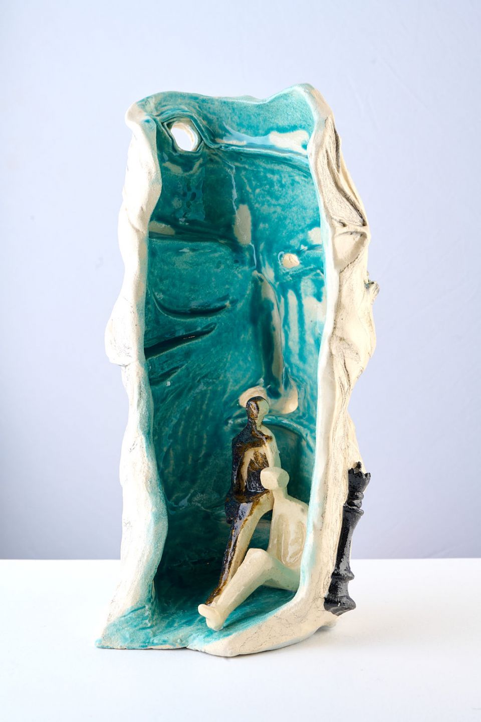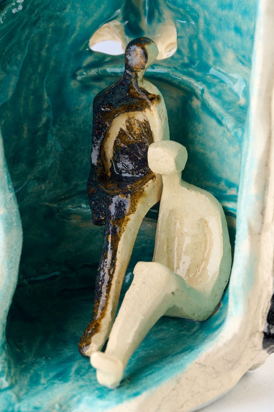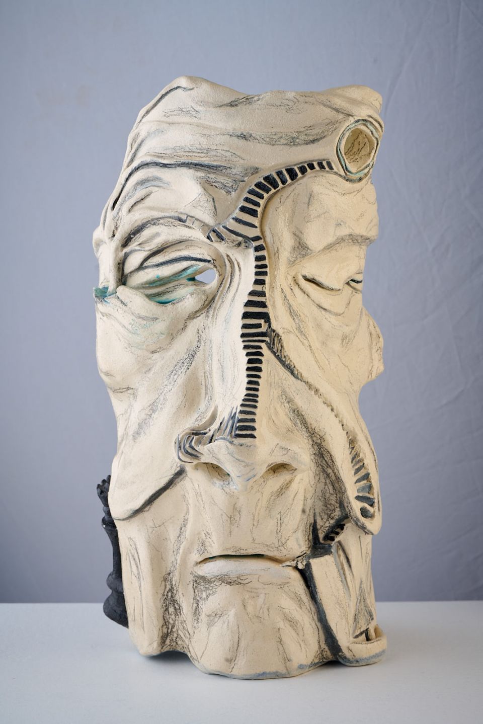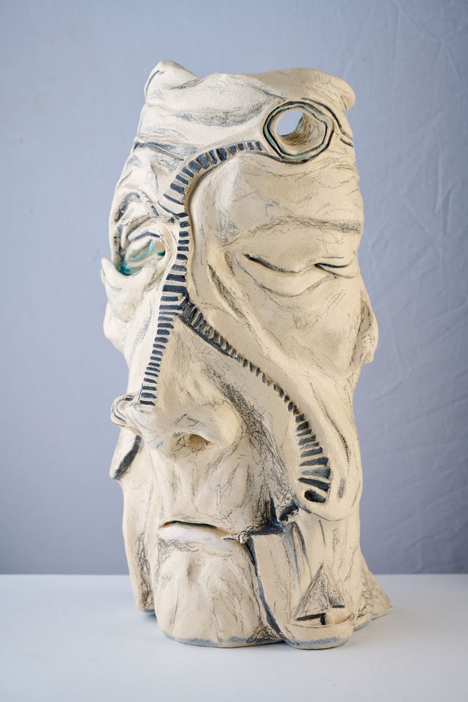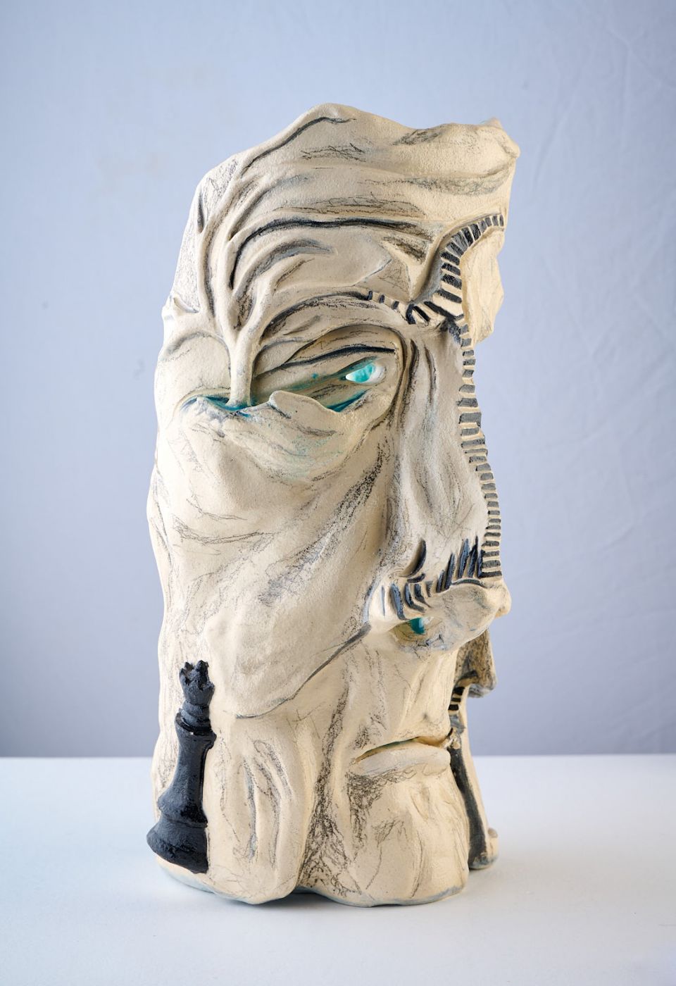 She is the Queen' was born from an image in my head while meditating; the shape was vivid and detailed. It felt like the instructions came from another world. The guidelines on where to start and what to make were clear, and I had no doubt about the stairs. I only needed to find a native American mask, and I found what I was looking for: the sign of a circle on the forehead.