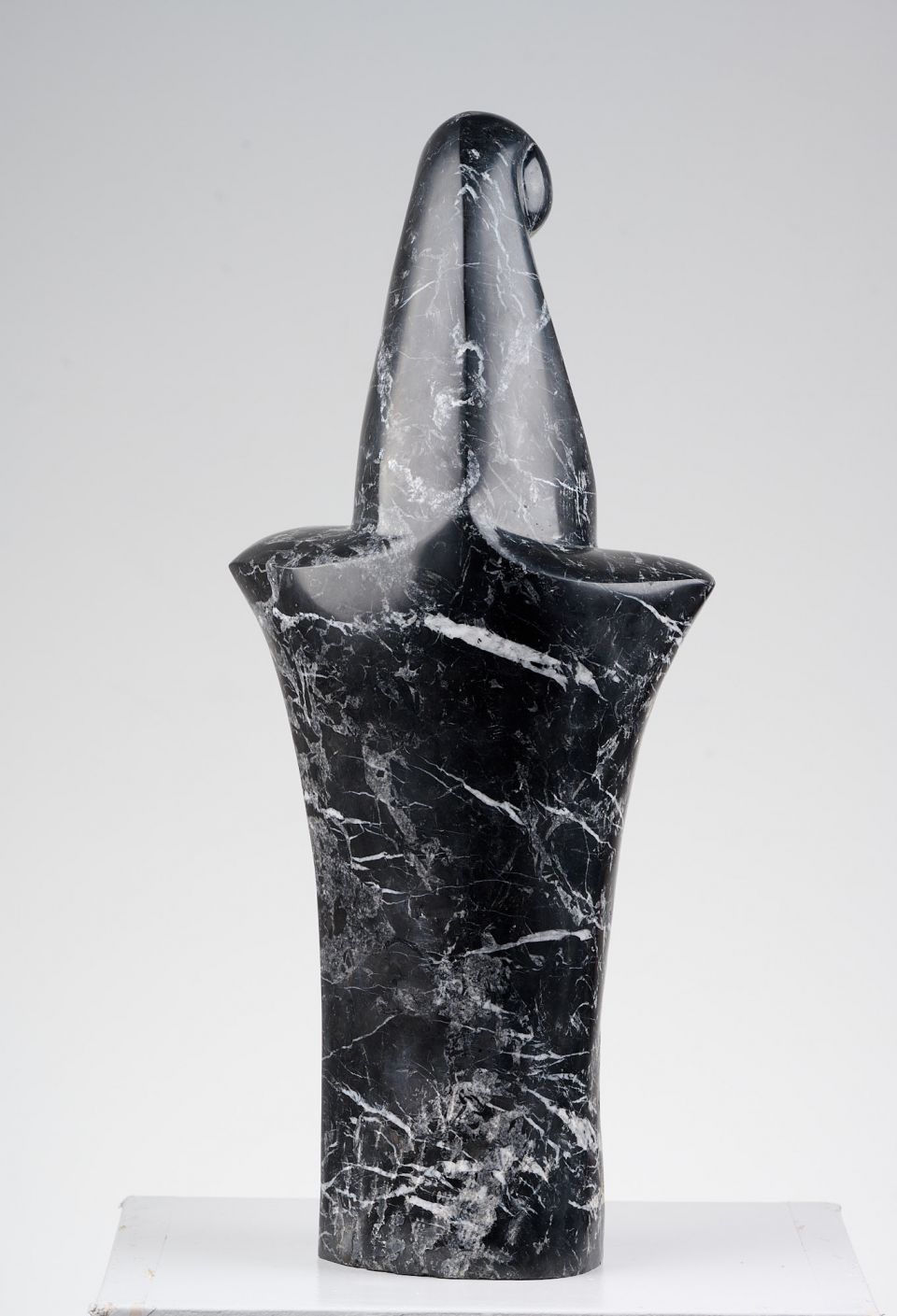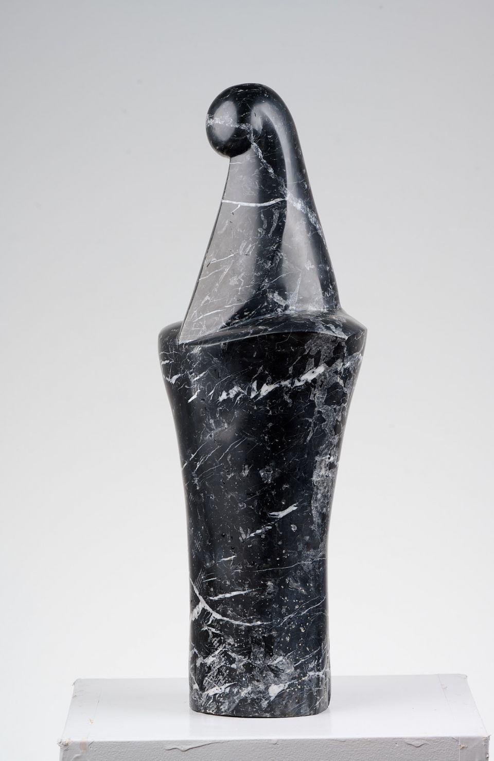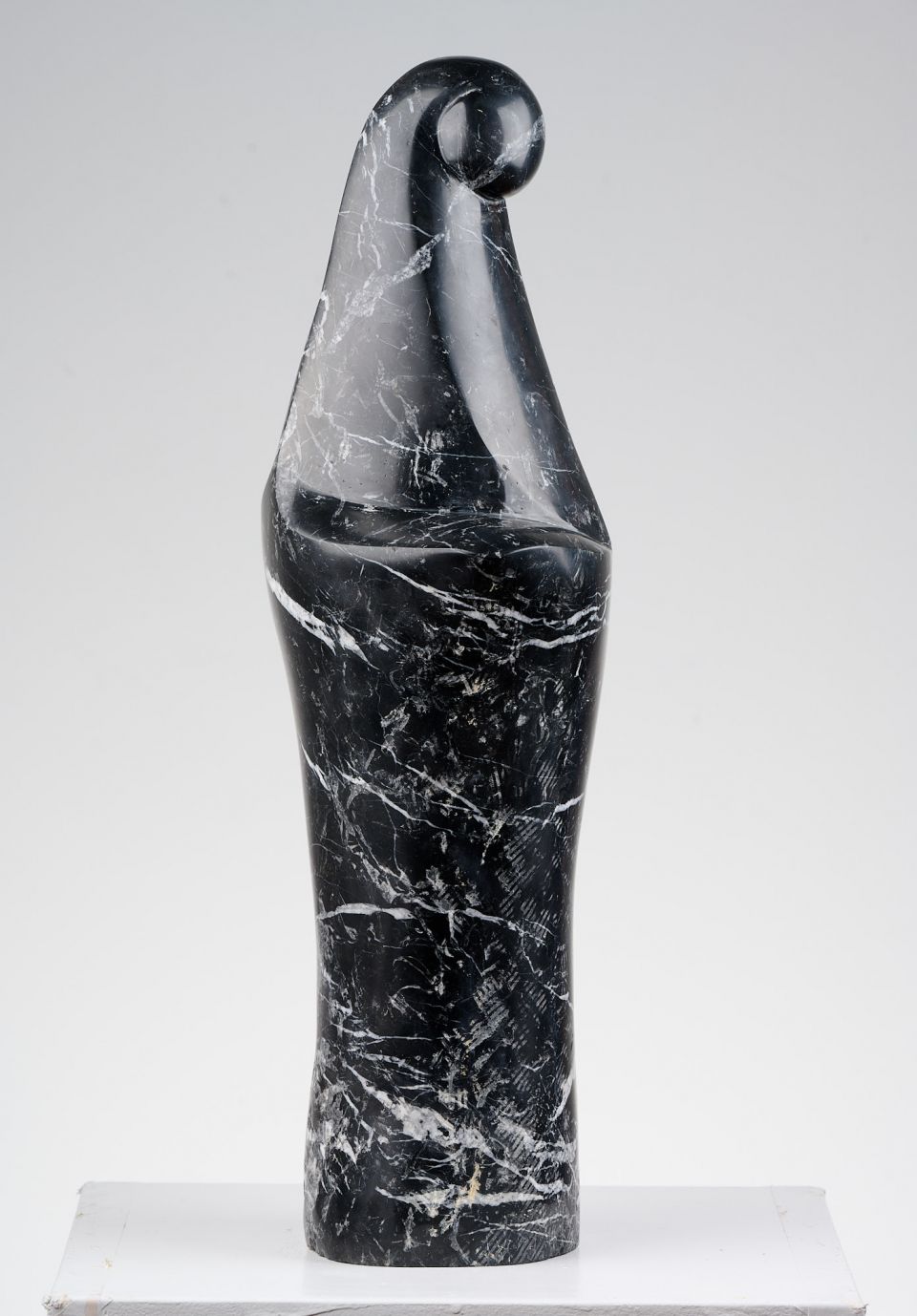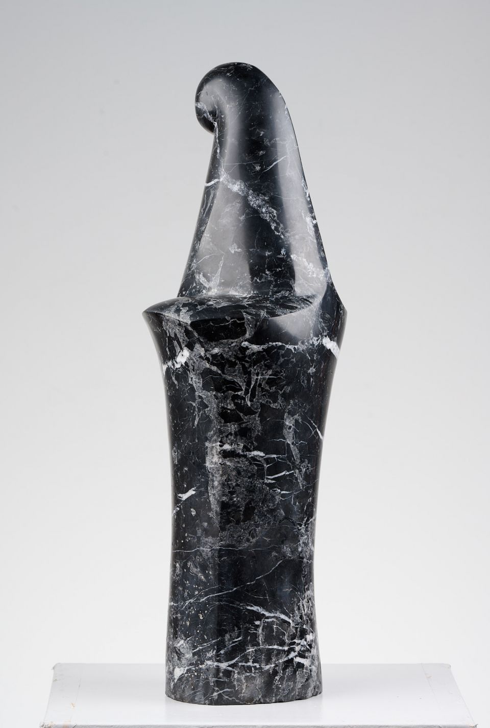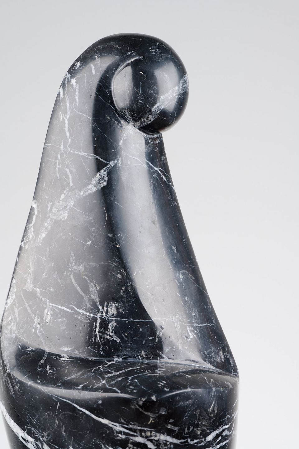 Male Torso, hand carved from Black Marquina marble, distills the male form into a bold, abstracted silhouette. The polished surface reflects strength and poise, while the stone’s natural veins speak to vulnerability and imperfection. Echoing both classical statuary and modern minimalism, the work explores masculinity as symbol, presence, and timeless human archetype.