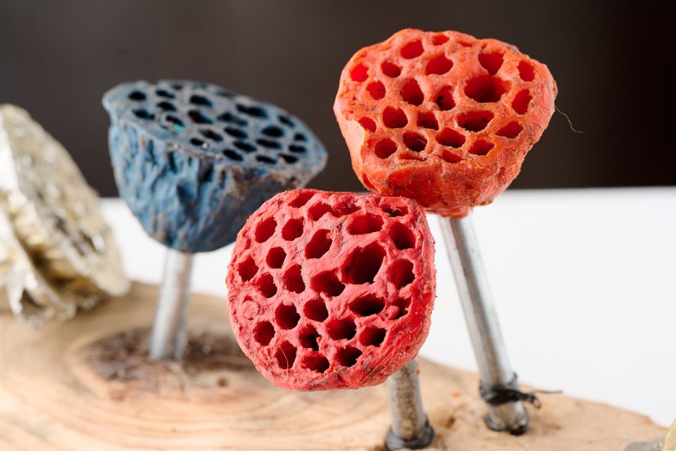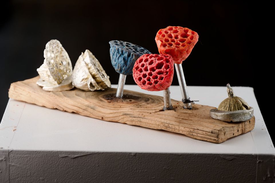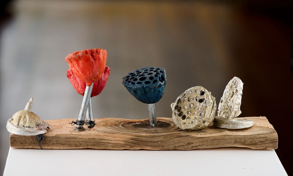 Lotus Pods is a work I made from recycled materials . It is influenced by the fecundity of native flora , its vibrant colour palette, sculptural forms and inherent beauty . I take inspiration from the wild and unfettered local fauna which is unique to my local coastline of St Kilda.